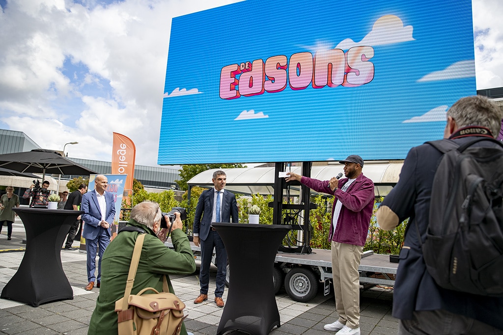 Cabaretier Edson da Graça en staatssecretaris Blokhuis in Hoofddorp voor lancering