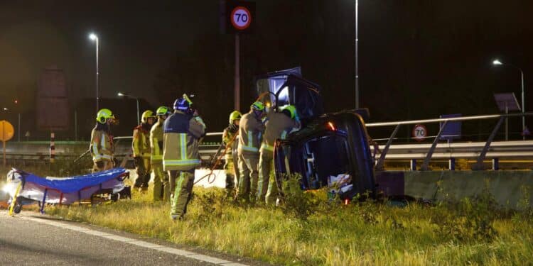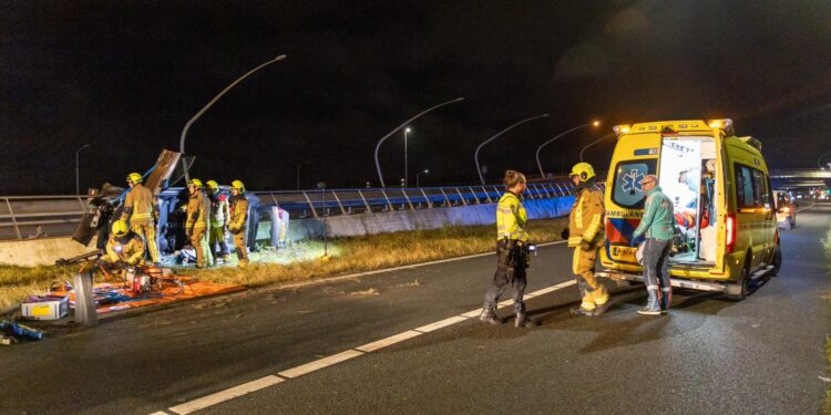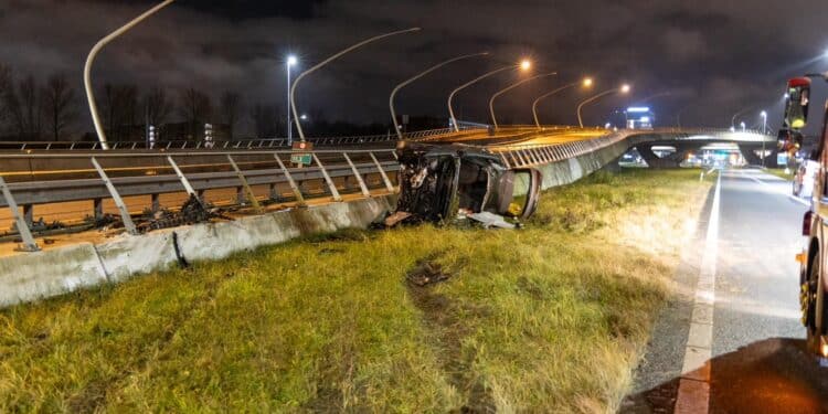 Een automobilist is afgelopen nacht met zijn auto tegen de fly-over richting de Waardepolder terecht gekomen. Vermoedelijk verloor de bestuurder de macht over het stuur vanuit de richting Amsterdam, kwam in het gras terecht en raakte in een slip. De auto kwam vervolgens op de zijkant tot stilstand.