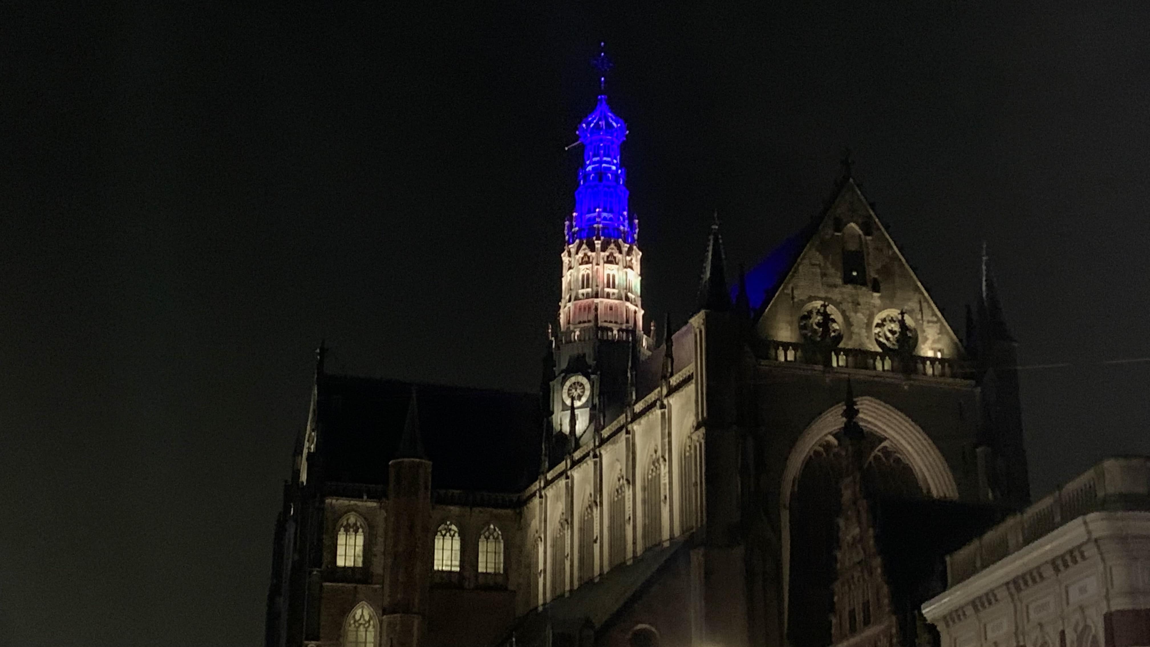 De toren van de Grote of Sint Bavo-kerk op de Grote Markt is vanavond aangelicht in de kleuren van de vlag van Oekraïne.