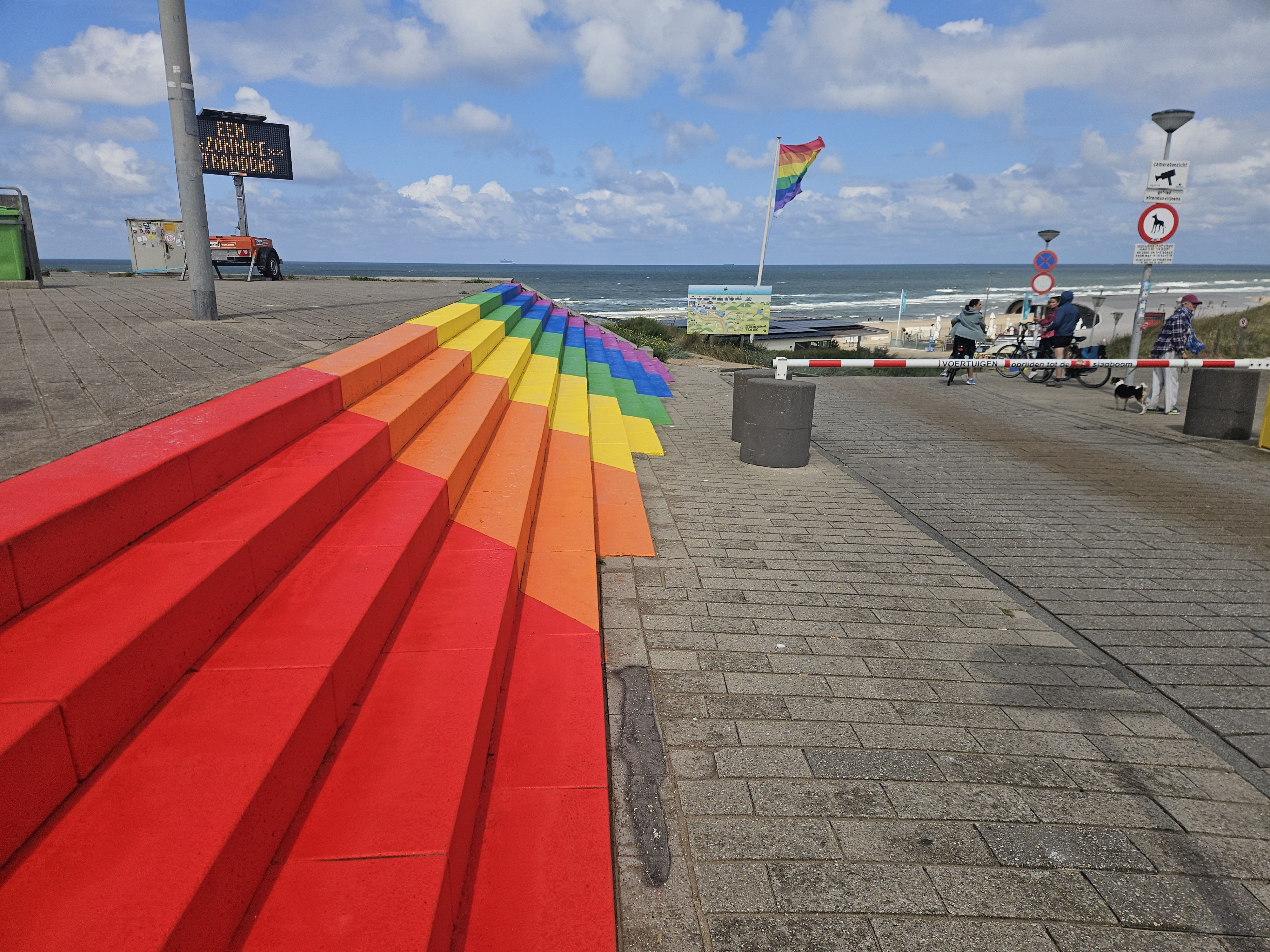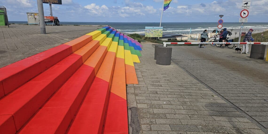 In Zandvoort vindt vandaag Pride at the Beach plaats, een moment dat de aangrenzende gemeente Bloemendaal aangrijpt om een opvallende regenboogtrap bij het strand te onthullen. “Ook bij ons is iedereen welkom”, zegt wethouder Thessa van der Windt. De vijftien meter brede trap in regenboogkleuren noemt ze een statement: “Je kunt er niet omheen.”