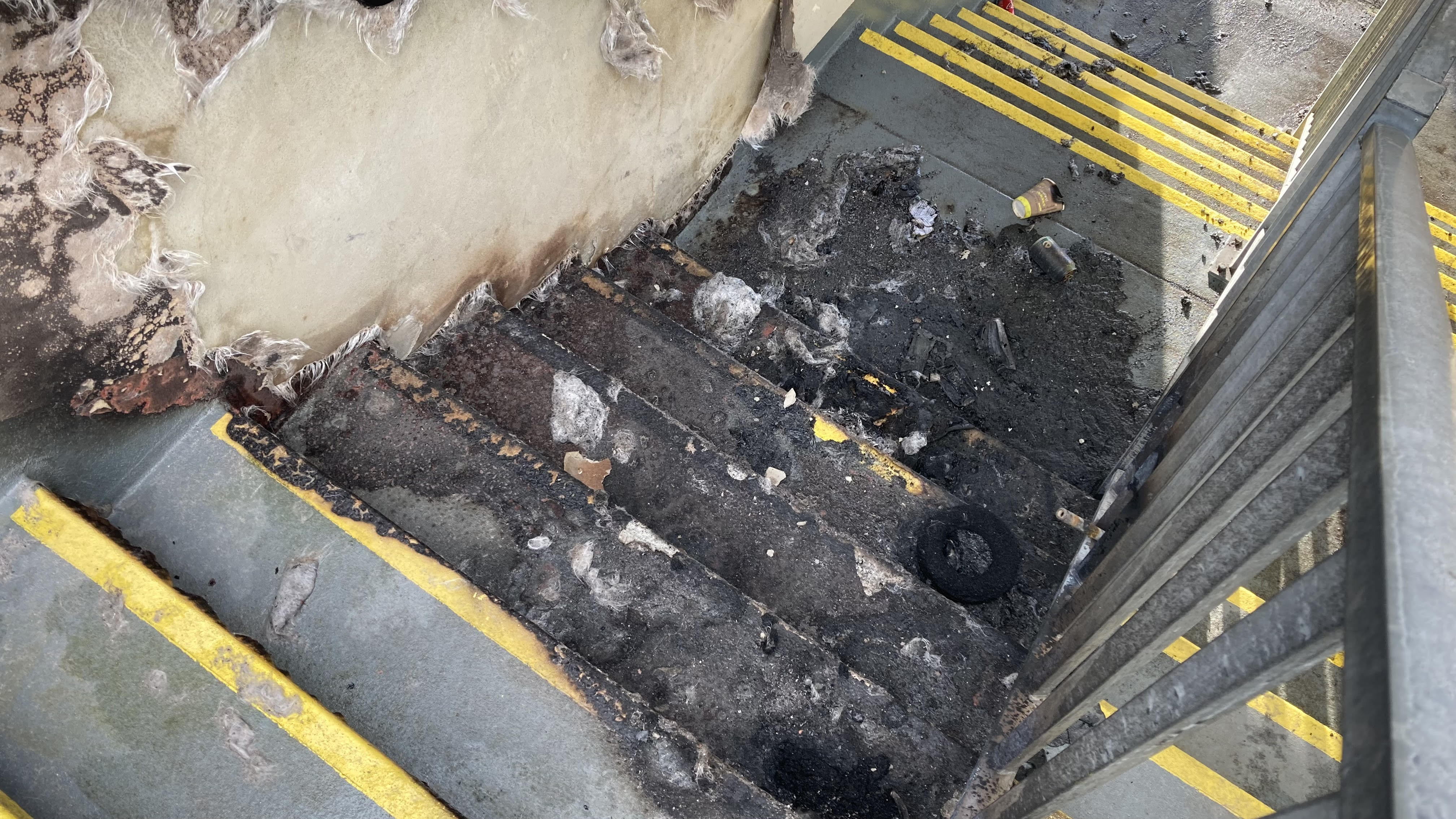 De politie zegt dat het zeer waarschijnlijk om brandstichting gaat en vermoedt dat er ‘iets van plastic, vermoedelijk een container’ is aangestoken. Bij daglicht is zondag te zien dat er ook verbrande blikjes op de bewuste trap ligggen.