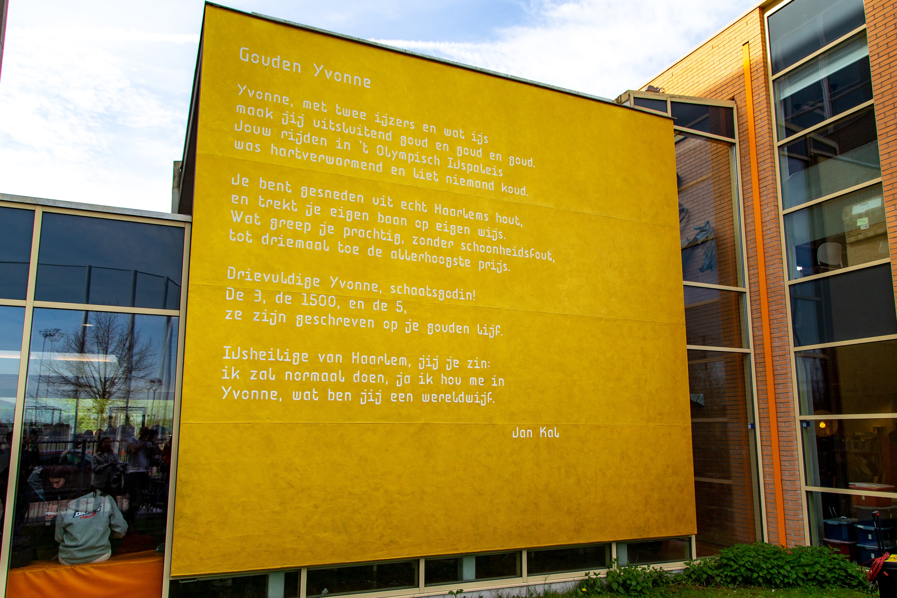 Olympisch schaatskampioen Yvonne van Gennip en Haarlemse dichter Jan Kal. – Haarlem105 / Erwin BartmanHet gedicht en de muurversiering zijn een eerbetoon aan de prestaties van de schaatslegende tijdens de Olympische Winterspelen van 1988. Het is een initiatief in samenwerking met het Haarlems literair genootschap en het Mendelcollege, een zogenoemde ’topsport talentschool’. Dit houdt in dat leerlingen die topsport beoefenen op deze school extra worden begeleid door docenten om school en sport te combineren.