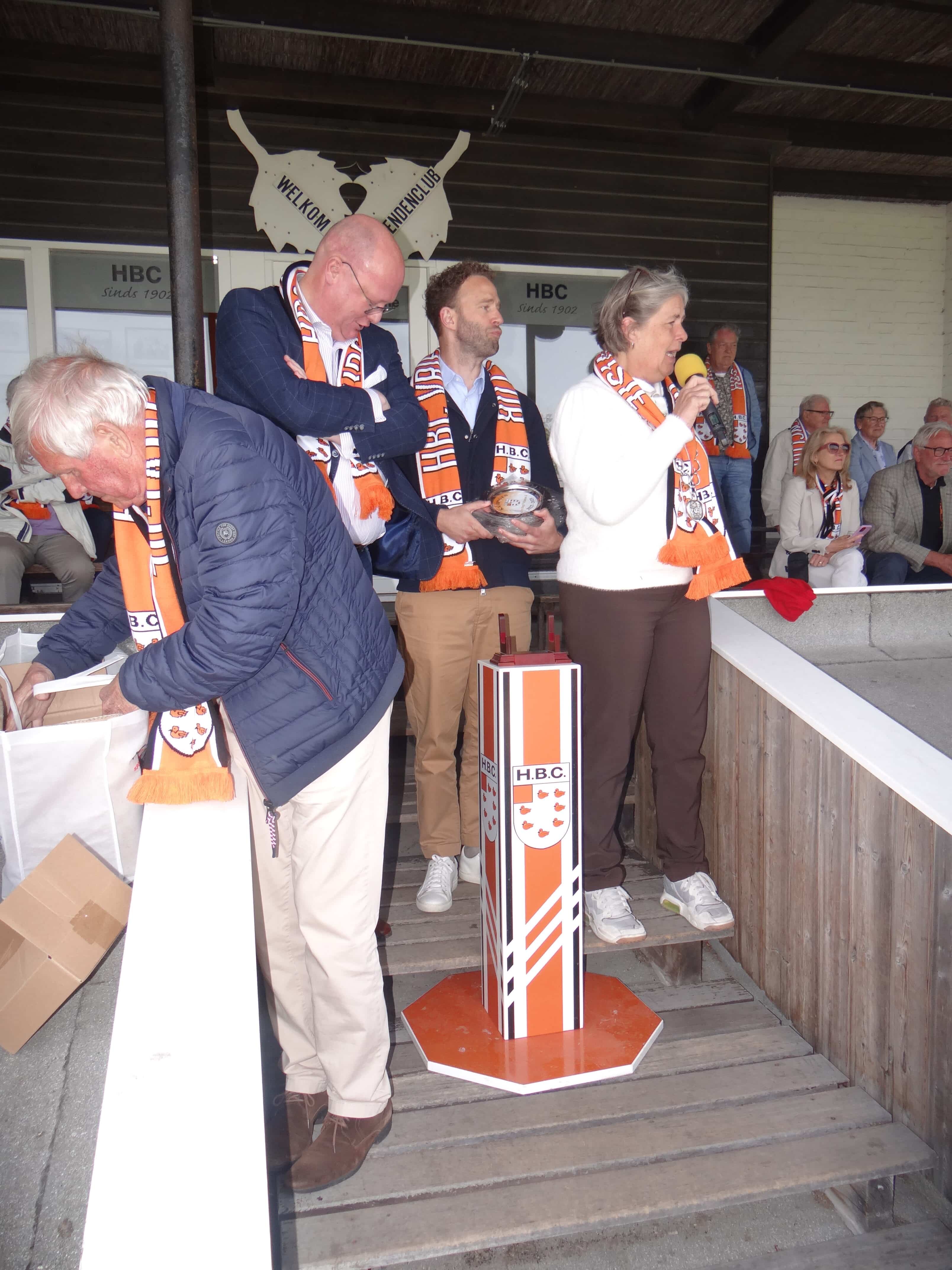 Na de wedstrijd verzamelden de spelers van HBC zich voor de trap van de tribune. Voor de tribunes hadden toeschouwers hun plek ingenomen om de uitreiking goed vast te leggen. Burgemeester Astrid Nienhuis, kreeg de microfoon om een paar woorden te spreken. “Ik weet niet heel veel van voetbal, maar ik zie een team dat voor elkaar gestreden heeft. Ik ben daarom ook trots dat jullie kampioen zijn geworden voor de vierde keer op een rij”, zegt ze. Daarna komen de spelers één voor één de trap op, om de vervolgens hun medaille en de replica in ontvangst te nemen. De aanwezige toeschouwers laten hun ‘kampioensjaal’ zien die de club speciaal heeft laten maken en gekocht kon worden. De aanvoerder, Bram Verhage, krijgt de schaal in zijn handen en toont hem boven zijn hoofd. Dit zijn bekende taferelen bij een club die kampioen is geworden.