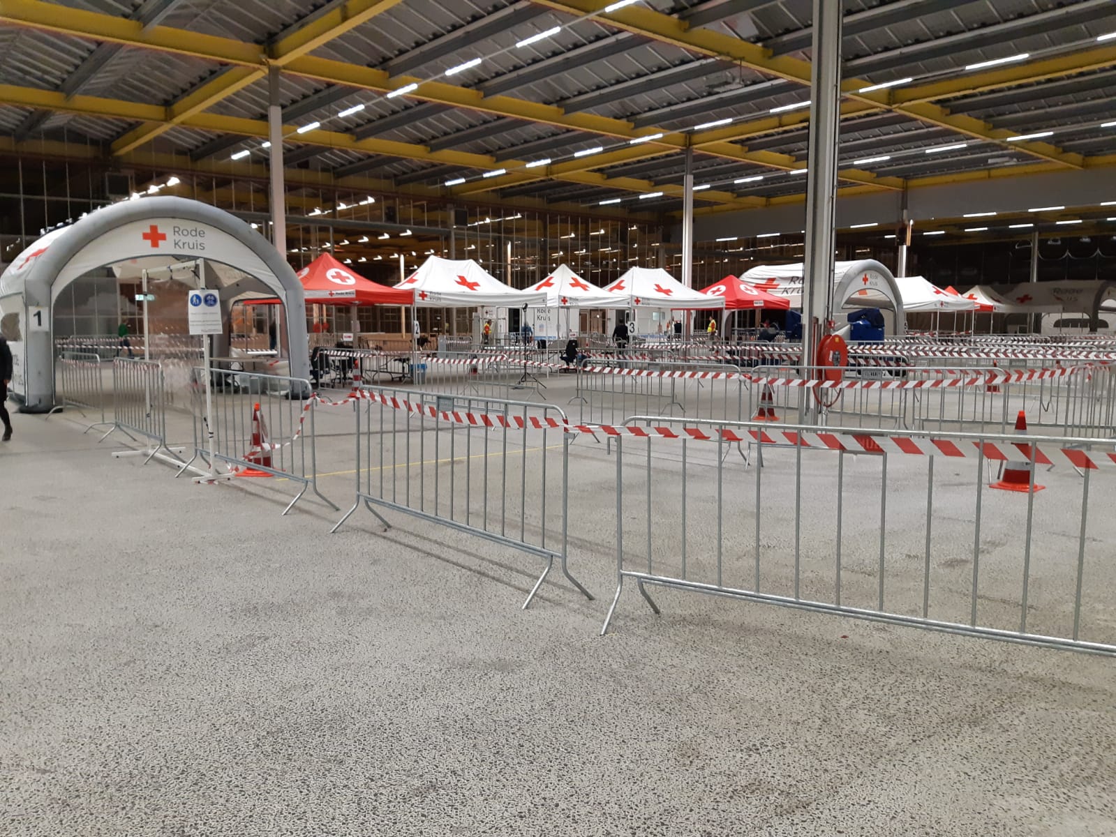 Medewerkers van het Rode Kruis nemen de tests af. “Het Rode Kruis helpt daar waar het nodig is en dit is duidelijk zo’n situatie”, zegt coördinator Machiel Pouw. Mensen van het Rode Kruis hebben gisteren in een paar uur tijd de inrichting van de Expo-hallen veranderd, zodat er drie teststations bij konden komen. “We zijn blij en trots dat we ons steentje kunnen bijdragen.”