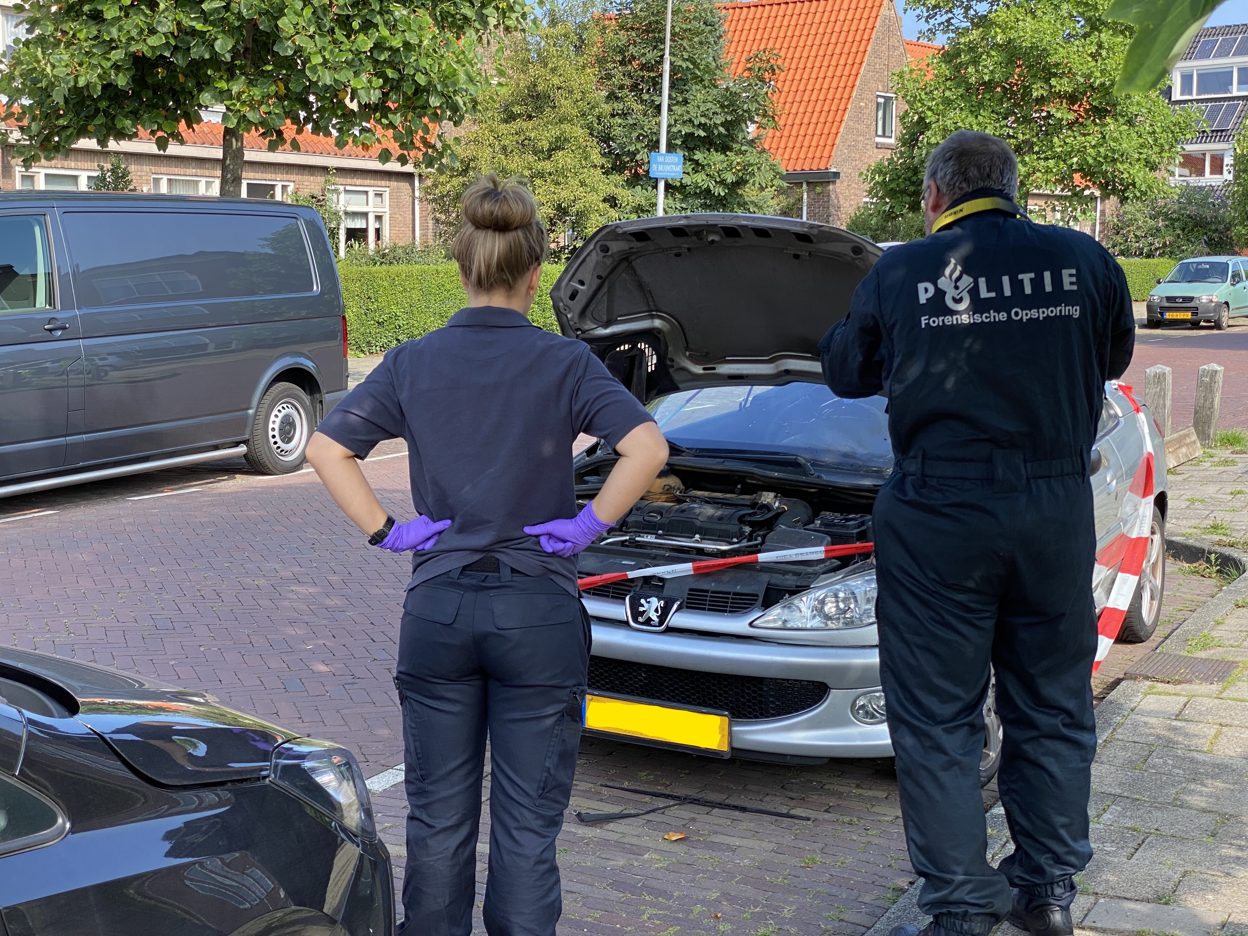 Sommige buurtbewoners komen nieuwsgierig een kijkje nemen als de technische recherche vanochtend onderzoek doet bij de beschadigde auto in de Van Oosten de Bruijnstraat in Haarlem-West. Voor de tweede keer in twee dagen is dezelfde auto het doelwit van een aanslag met vermoedelijk zwaar vuurwerk.