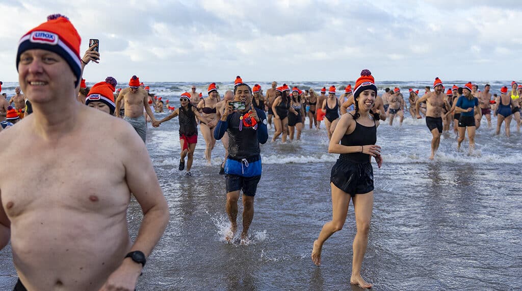 Ondanks de kou hadden de deelnemers er veel lol in om het water in te duiken. De nieuwjaarsduik in Zandvoort is van de oudste van het land. Alle deelnemers kregen een muts, een vaantje en een bakje erwtensoep om op te warmen.