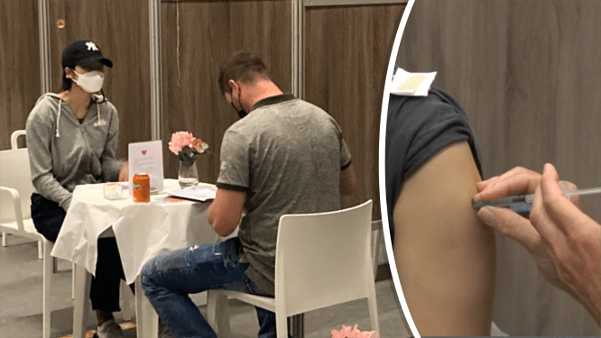 Eén van de gevaccineerden gaat aan het tafeltje met een kaarsje, een bloemetje en een hartjesballon zitten omdat hij het wel leuk idee vindt. Hij houdt een kwartier lang een oudere dame gezelschap. Maar nu wil hij snel met zijn eigen vrouw op vakantie, “zonder vijf keer een stokkie in mijn neus.” Op deze manier wachten na de prik is in ieder geval wel een leuke bijkomstigheid. “Het is iets anders dan alleen maar wachten tot je er bij neervalt of dat je weer weg mag.”