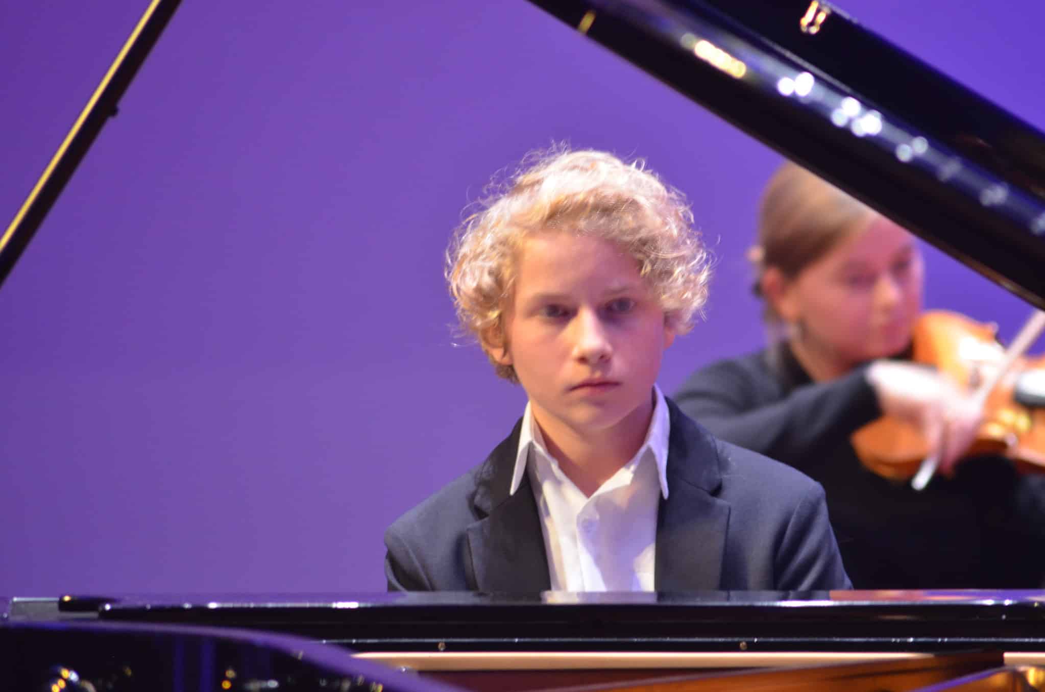David Kooi – foto: Boris HoekmeijerAls solist David Kooi daarna het pianoconcert no. 3 uitvoert komt de muzikaliteit van de jonge pianist (14 jaar) en het Kennemer Jeugd Orkest echt vol tot bloei. Het samenspel van de pianist en het orkest is prachtig. Na het eerste deel krijgt de pianist al een groot applaus. Er volgen echter nóg twee delen. Het derde deel is een mooie afsluiting van dit pianoconcert. Met een daverend applaus en bravogeroep gaat het hele publiek staan om zijn enthousiasme te uiten. Daarna is het pauze.