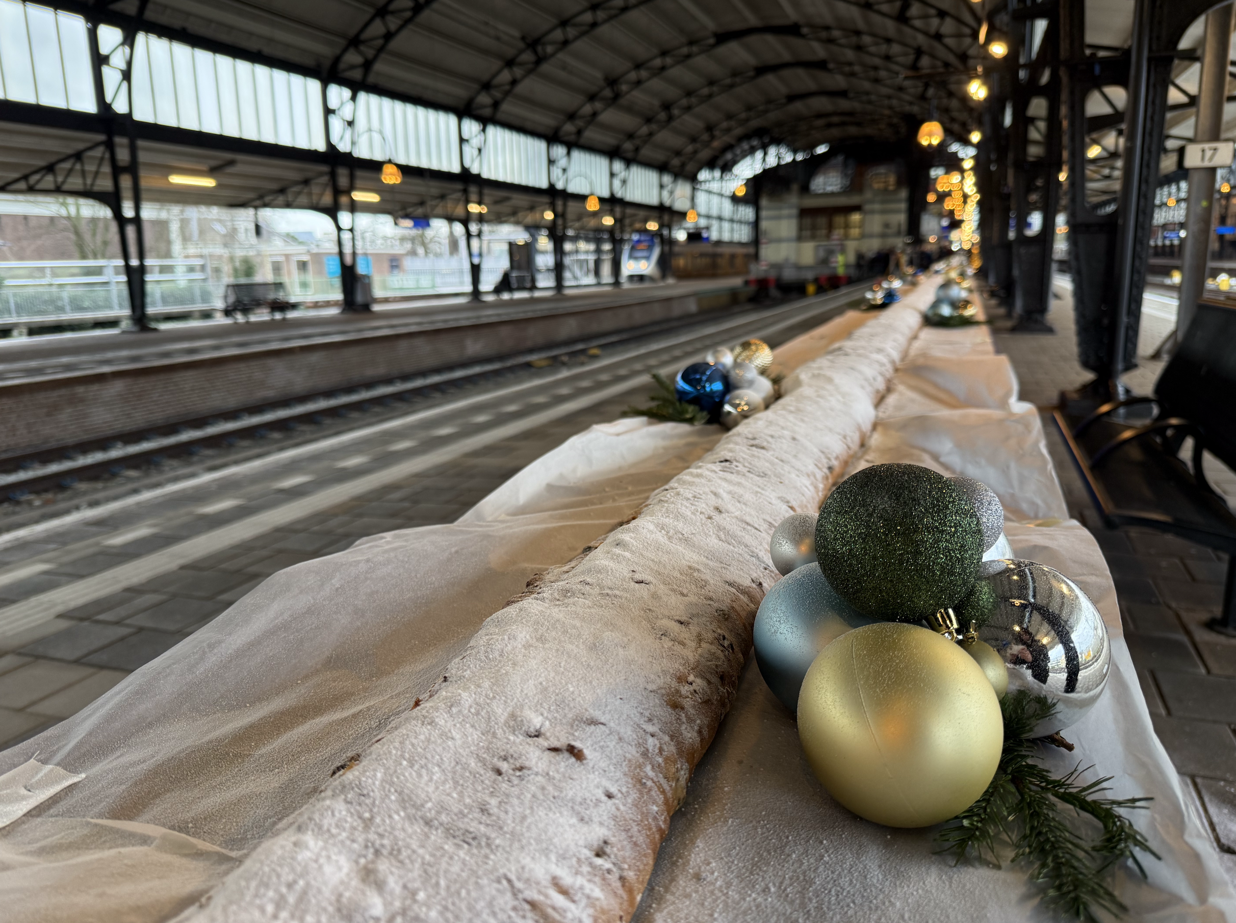 Stationsmanager Mattijs Peters kwam ook een kijkje nemen bij de kerststol op perron 3. “Wij zijn gevraagd om mee te werken omdat gezocht werd naar een overdekte locatie die lang genoeg is”, legt Peters uit. De reden om mee te werken was het maatschappelijke karakter: de stol wordt volledig aan de voedselbank gedoneerd.