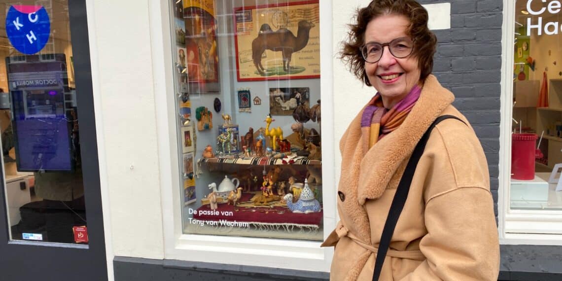 De Haarlemse Tony van Wechum ging 34 jaar geleden in Egypte met een witte kameel op de foto: “Ja, ergens daar ben ik gegrepen door het ‘kamelenvirus’.” Ze kocht daar haar eerste kamelen beeldje, het begin van haar enorme kamelen collectie die vanaf vanmiddag geëxposeerd wordt in het kleinste museum van Haarlem.