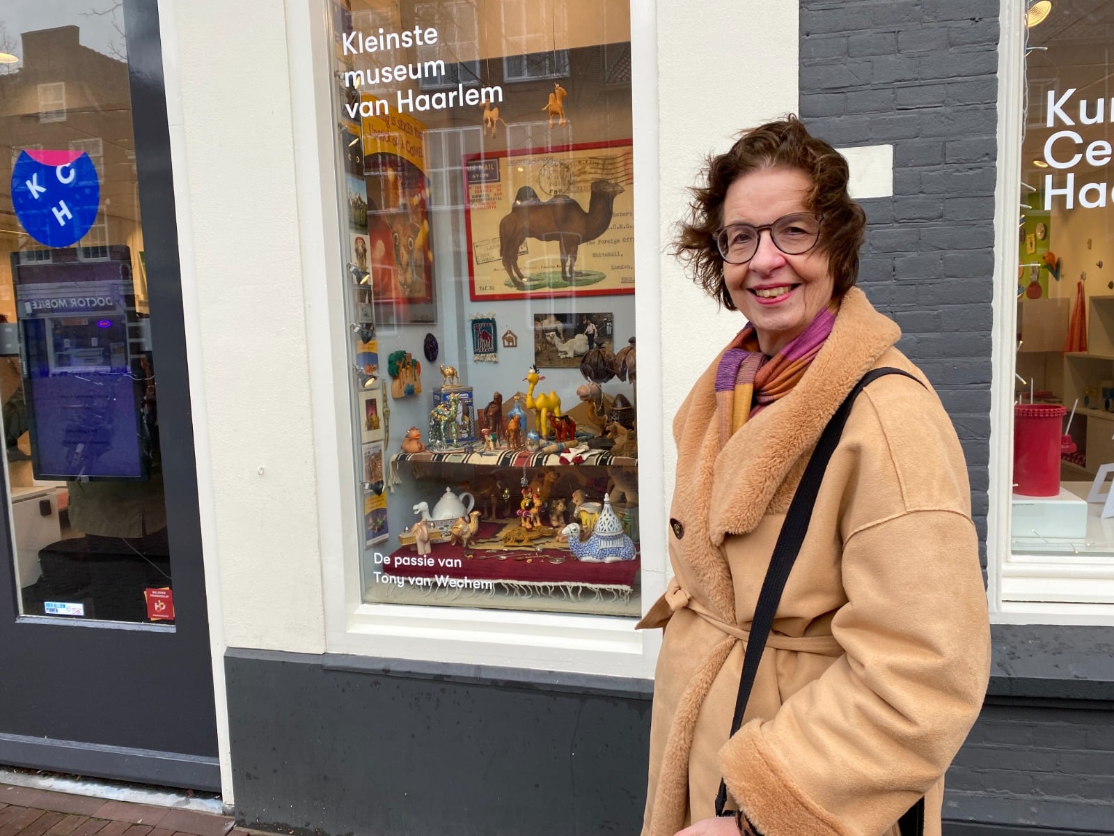 De Haarlemse Tony van Wechum ging 34 jaar geleden in Egypte met een witte kameel op de foto: “Ja, ergens daar ben ik gegrepen door het ‘kamelenvirus’.” Ze kocht daar haar eerste kamelen beeldje, het begin van haar enorme kamelen collectie die vanaf vanmiddag geëxposeerd wordt in het kleinste museum van Haarlem.