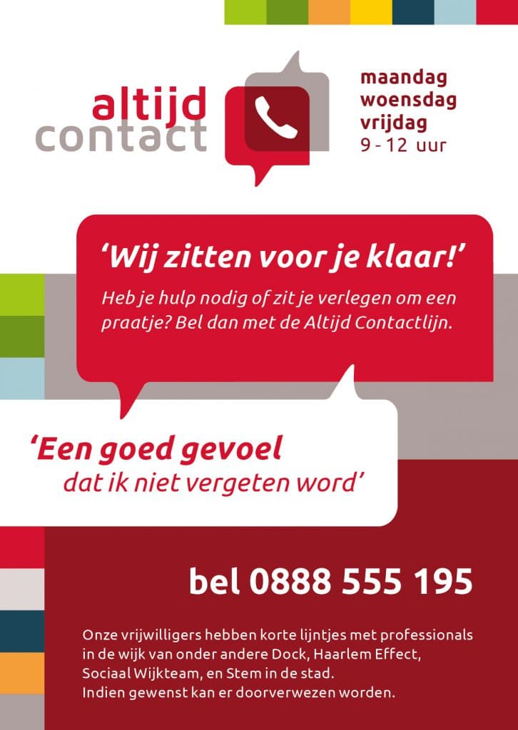 Iedereen die hulp nodig heeft of een praatje wil maken, kan terecht bij de Altijd Contactlijn. Bellen kan elke maandag, woensdag en vrijdag van 9.00 tot 12.00 uur. De lijn wordt gerund door vrijwilligers. Zij kunnen ook meedenken in praktische oplossingen. Als het nodig is, leggen zij contact met organisaties in de buurt waar je woont. De bellijn is een samenwerking tussen onder andere DOCK, Haarlem Effect, Sociaal Wijkteam en Stem in de Stad. Ze willen eenzaamheid in de stad en de gevolgen daarvan op emotioneel en praktisch vlak verminderen. Zeker nu, in coronatijd is hier veel behoefte aan, zegt de organisatie.