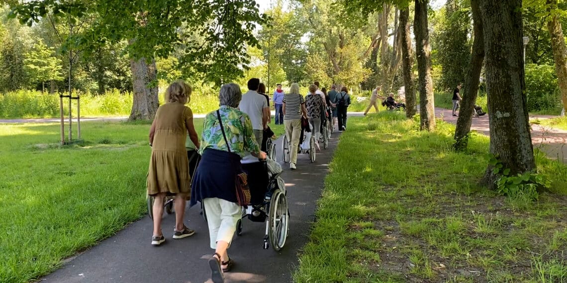 “Wij hebben gevraagd of wij wat voor de mensen in Schoterhof konden doen”, legt een handhaver uit. De handhavers duwen de rolstoelen, maar zorgen ook voor veel gezelligheid. Ze komen voornamelijk uit de buurt zelf. “Handhavers uit andere wijken doen daar weer iets anders”.