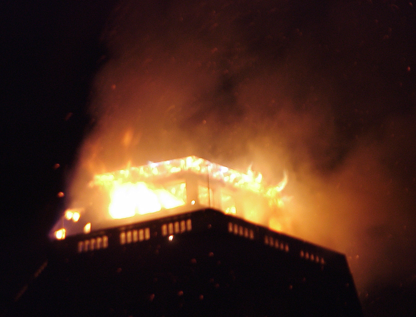 Door een combinatie van een brandende houten constructie en een stevige wind ontstaat er een vonkenregen boven het Watertorenplein. “We riepen ook tegen mensen dat ze met tuinslangen hun daken nat moesten houden, omdat wij niet alles en iedereen konden bedienen daar. Er staan namelijk nogal wat huizen”, vertelt Rocco.