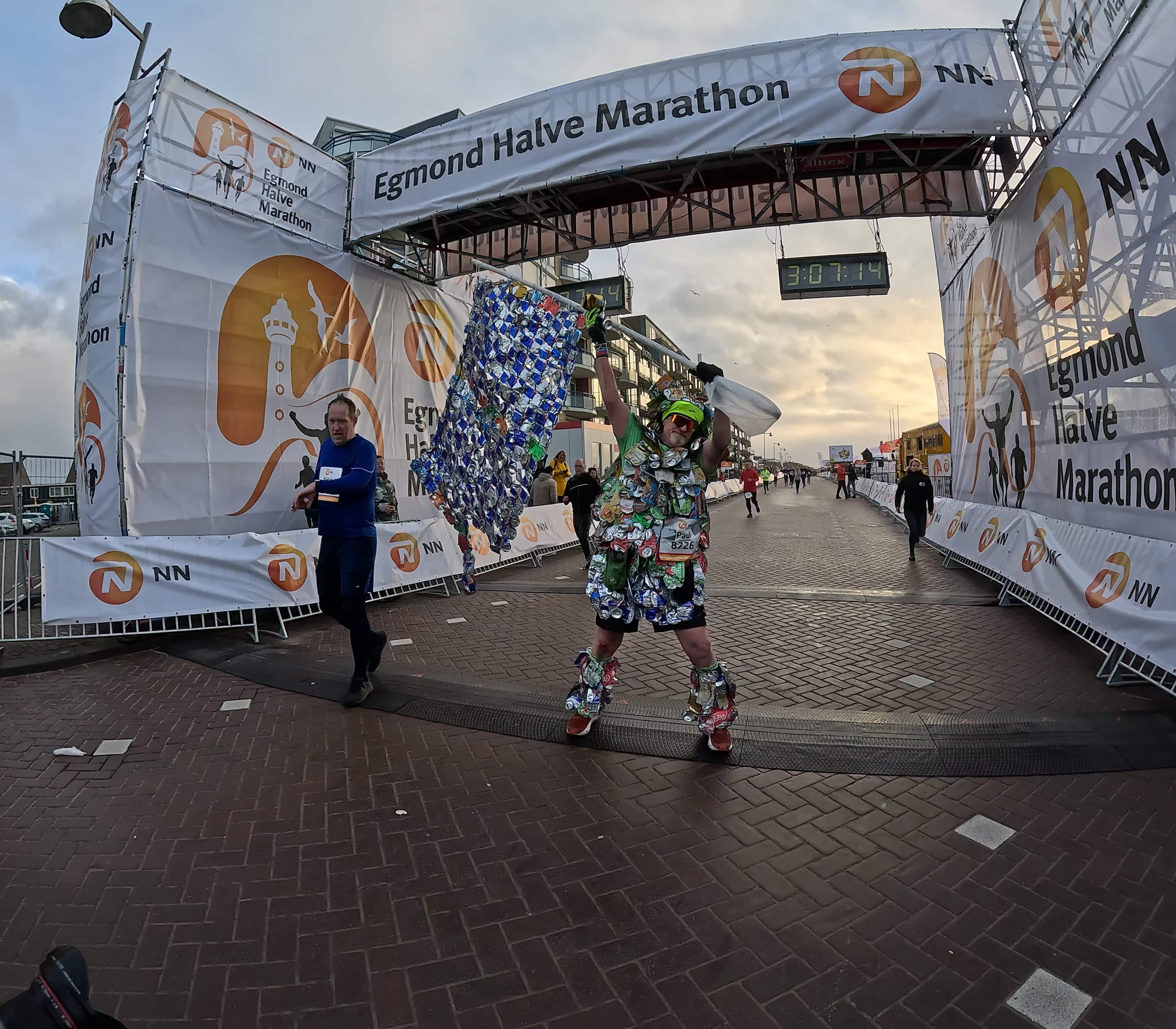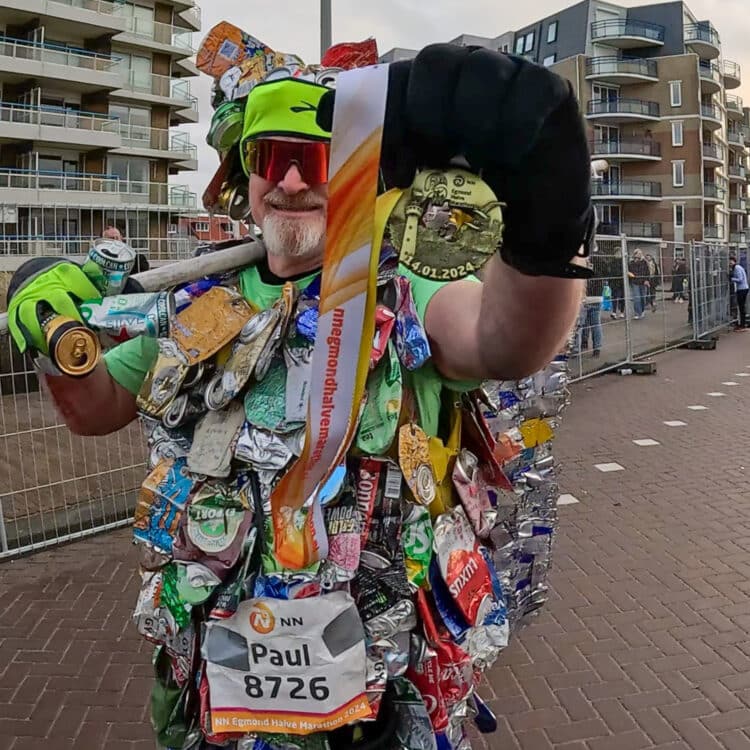 Al dertien jaar is de Haarlemse Paul Waye aan het ploggen, maar gisteren liep hij zijn grootste prestatie tot nu toe: de halve marathon van Egmond aan Zee in een zelfgemaakte outfit van zwerfblikjes. “Binnen drie weken had ik alle blikken verzameld”, vertelt hij trots.