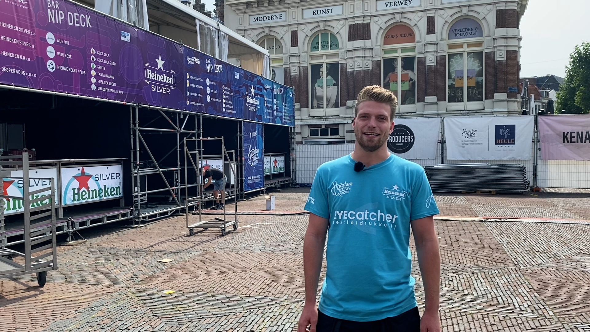 Van een podium met honderden lampen tot kabelgoten en van klaarstaande prullenbakken tot blinkende barren; tevreden loopt Thijs Moerland, die verantwoordelijk is voor de horeca op de Grote Markt, over het terrein. “Er zijn zo’n vier punten waar de achtduizend bezoekers die per dag komen drank kunnen bestellen. We hebben de taps aangesloten en alles is in principe klaar om te worden gebruikt”, vertelt Moerland.