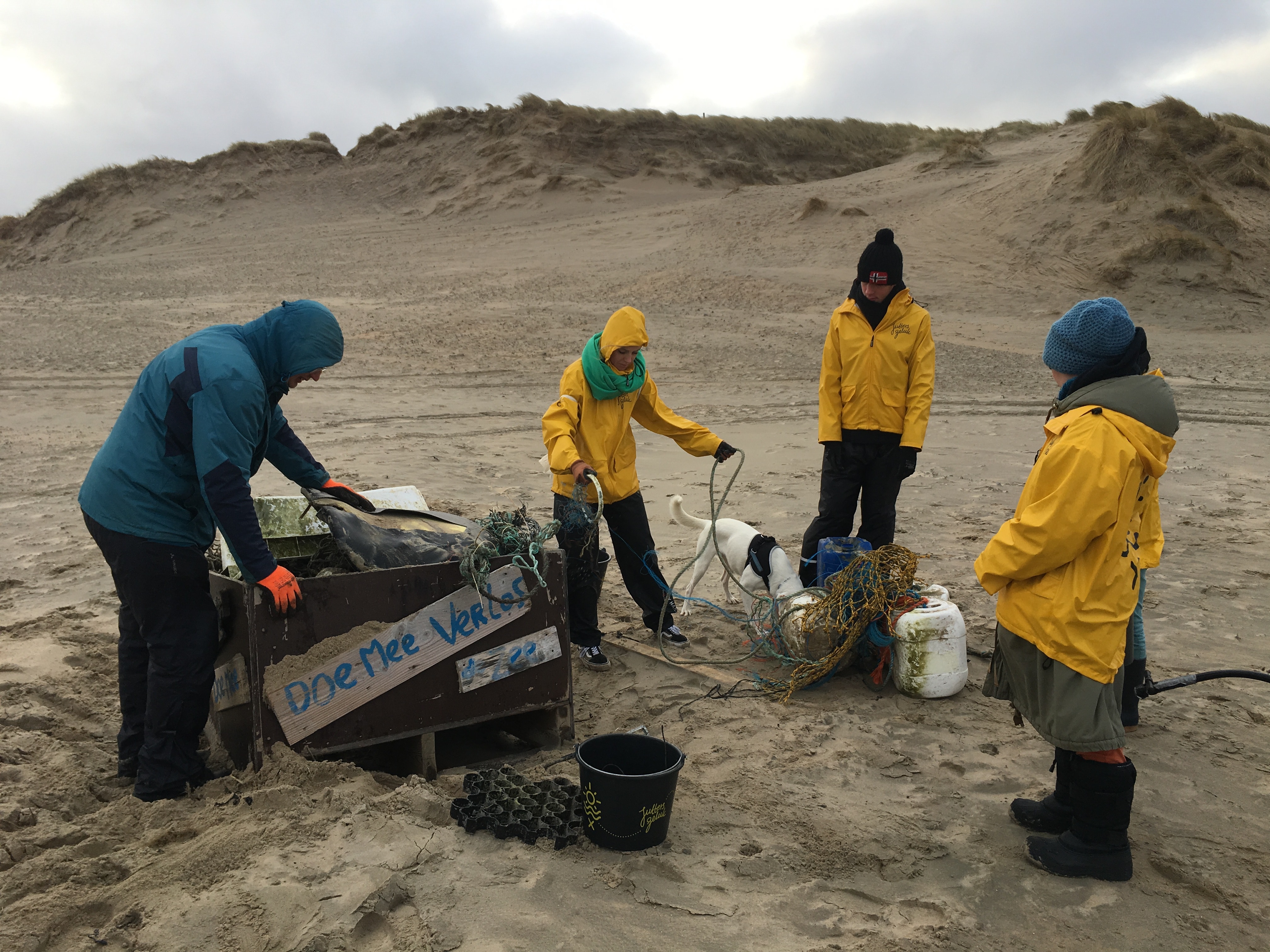 Op de bakken staat de oproep ‘Doe mee, verlos de zee’, een leus van Matthijs Lievaart. Hij verzamelde tien jaar geleden een berg afval op de stranden van Goeree-Overflakkee. Daar plaatste hij een bordje bij met deze tekst erop. De berg afval was, toen hij twee weken later terugkwam, flink groter geworden. Steeds meer gemeenten aan de Nederlandse kust nemen zijn initiatief sindsdien over.