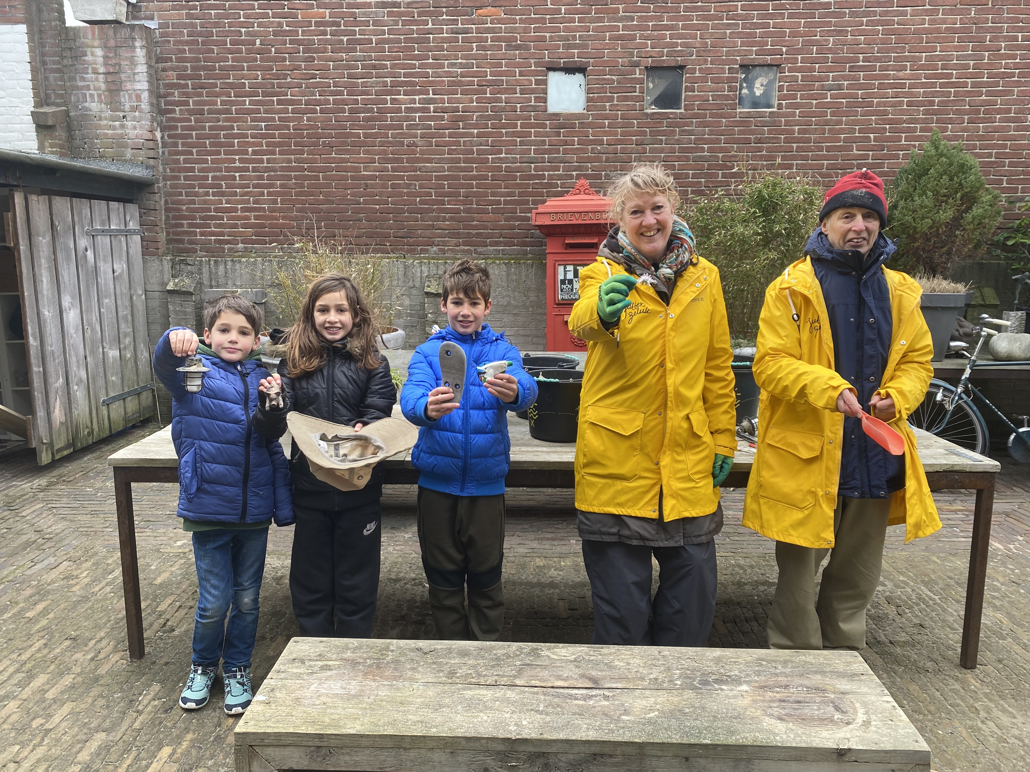 Na een goed uur lopen en flink wat zand in de haren zitten de emmers van de jutters vol met visserstouw, hout, rietjes, een drinkbak voor een hond en een safarihoed. “Het is een flinke vangst en we gaan nu alles netjes sorteren.”