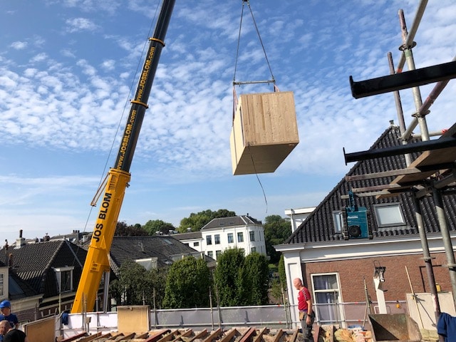“De opbouw in de smalle straat is nogal een operatie, maar heel spectaculair”, volgens Berendsen. “De architect en aannemer hebben rekening gehouden met het smalle gedeelte van het centrum waar we zitten. En vanwege de weersomstandigheden moet de klus snel geklaard worden. In twee dagen zijn alle kamers geplaatst.”