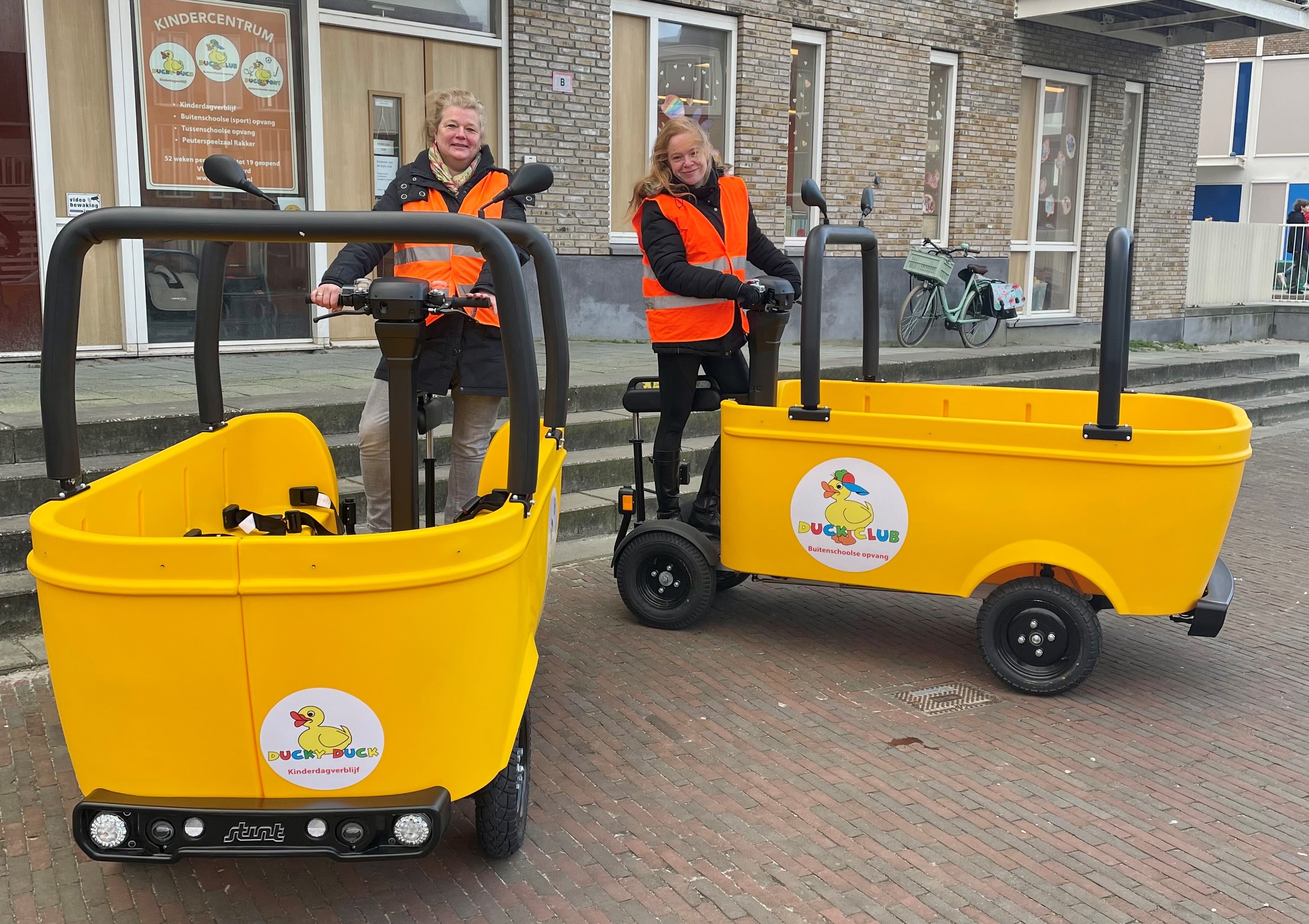 De twee nieuwe BSO-bussen van het kinderdagverblijf zijn geel met een vrolijke eend erop. “Een van de nieuwe beveiligingen die is ingebouwd is dat de bestuurder een certificaat nodig heeft om het te besturen”, zegt directeur Herman van der Zwet. “Daarvoor moet zowel een theorie als praktijkexamen worden behaald.” Een andere veiligheidsmaatregel is dat de stint automatisch stopt als de bestuurder afstapt.
