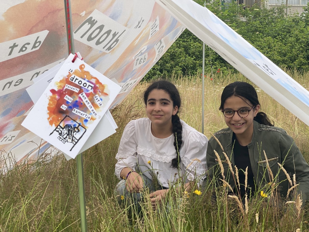 Op het grasveldje aan de Aziëweg Schalkwijk staan vijf ‘droomtentjes’ met gedichten. Deze zijn de afgelopen weken gemaakt door kinderen van basisschool de Globe. De tenten zijn onderdeel van de kunstroute ‘Het Ongeziene Gezien’ van Stichting Kapsalon.