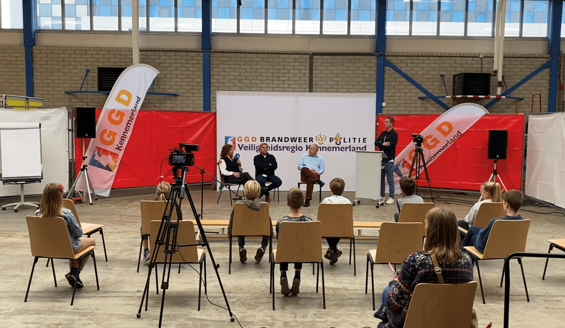 Na het theoretische gedeelte gaan de kinderen naar een ruimte die is ingericht als persruimte: met camera’s, microfoons en stoelen voor de kersverse ‘journalisten’ met er tegenover drie stoelen voor de mensen die de vragen gaan beantwoorden: directeur van de GGD Bert van de Velden, brandweervrouw Sandra Tol en kinderarts Michel Weijerman.