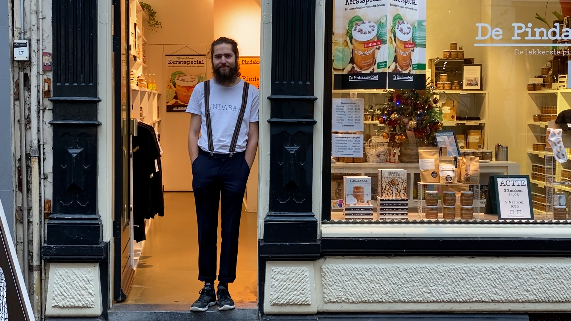 Terug in de winkel waar pindakaas wordt verkocht staat Beukema nog steeds met zijn bretels en knot, en veel meer mensen zijn er niet geweest. “Het is niet echt druk vandaag. Alle andere winkels zijn dicht en dat merk je. Ik denk dat ik maar zo’n vijftien potjes pindakaas heb verkocht.”