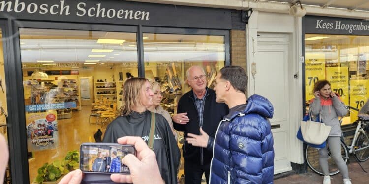 De demissionaire premier blijkt nog steeds mateloos populair. Tijdens zijn bezoek aan de winkelstraat wilde bijna iedereen wel even met hem op de foto. Er sprong zelfs een dame uit de kappersstoel toen ze Rutte voorbij zag lopen. Met natte haren en kappersjas nog om ging ze snel met de premier op de foto.