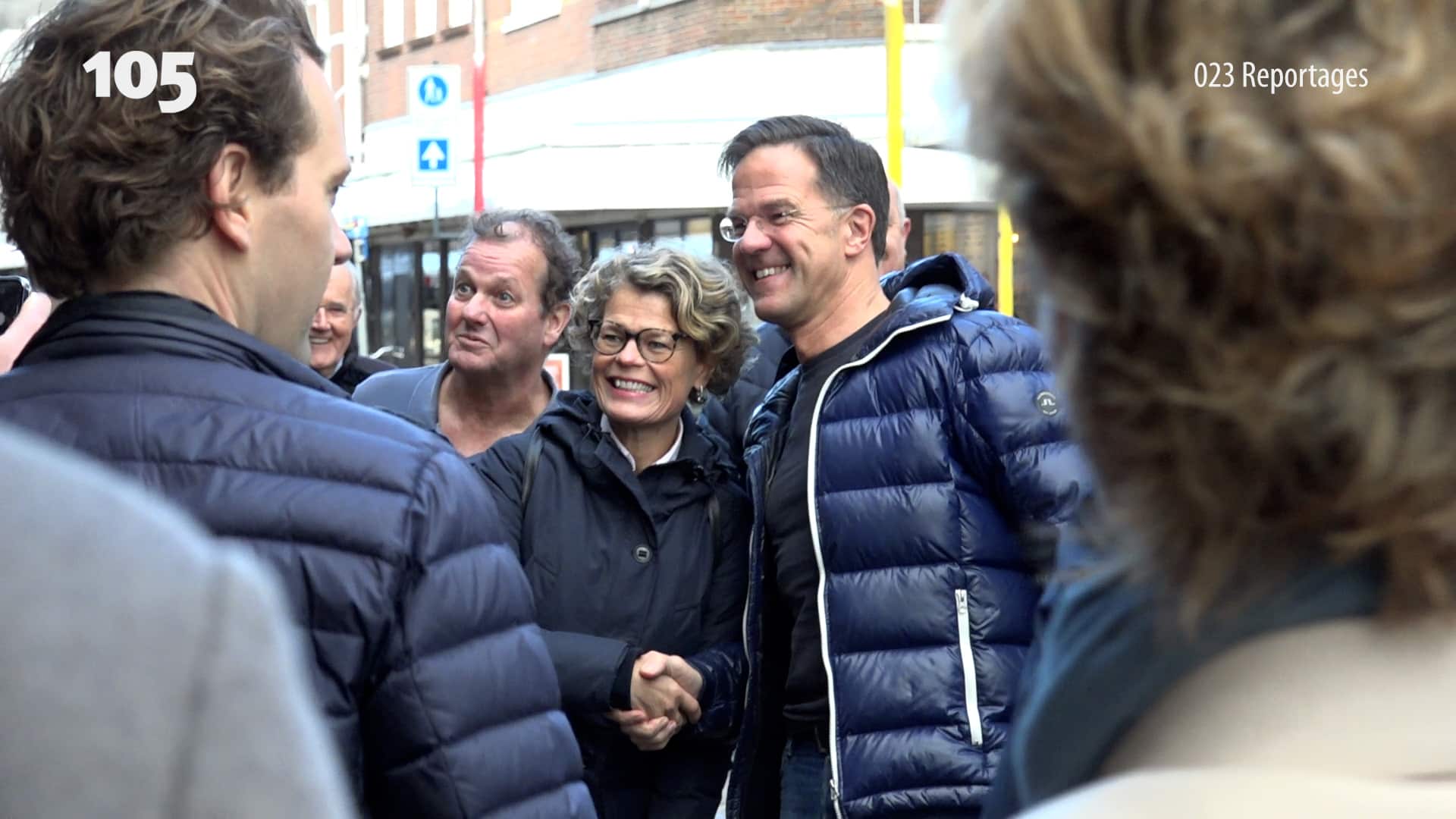 Nadat de eerste mensen de afzwaaiend premier hadden herkend werd het al snel druk in de winkelstraat met mensen die met Rutte op de foto wilden. “Ik geef u wel eerst een flyer”, zegt Rutte om daarna uitgebreid de tijd te nemen om op de foto te gaan. Op de flyers prijken de twee Haarlemse VVD-kandidaten: Peter van Kessel en Pim van Strien.