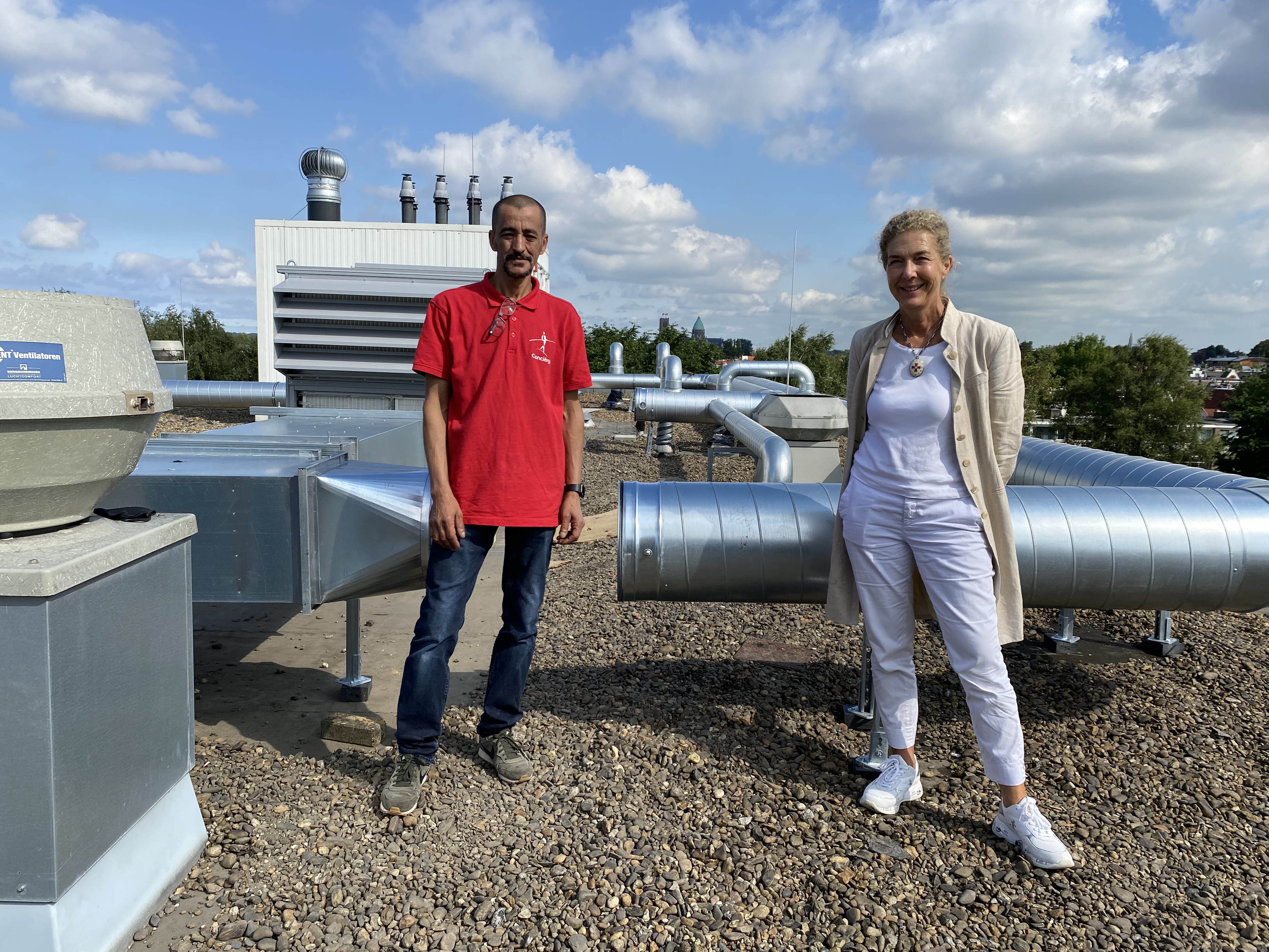 Vanwege de coronacrisis moesten scholen hun luchtventilatie verbeteren. Zo ook het Sancta Maria waar het gebouw bestaat uit een nieuw en oud gedeelte. “We staan hier op het dak van het in 2010 nieuw opgeleverde gedeelte van het gebouw en hier is het luchtventilatiesysteem anders dan op het oude gedeelte. Het zijn, helaas, twee aparte units”, zegt Martine Krijnen, conrector.