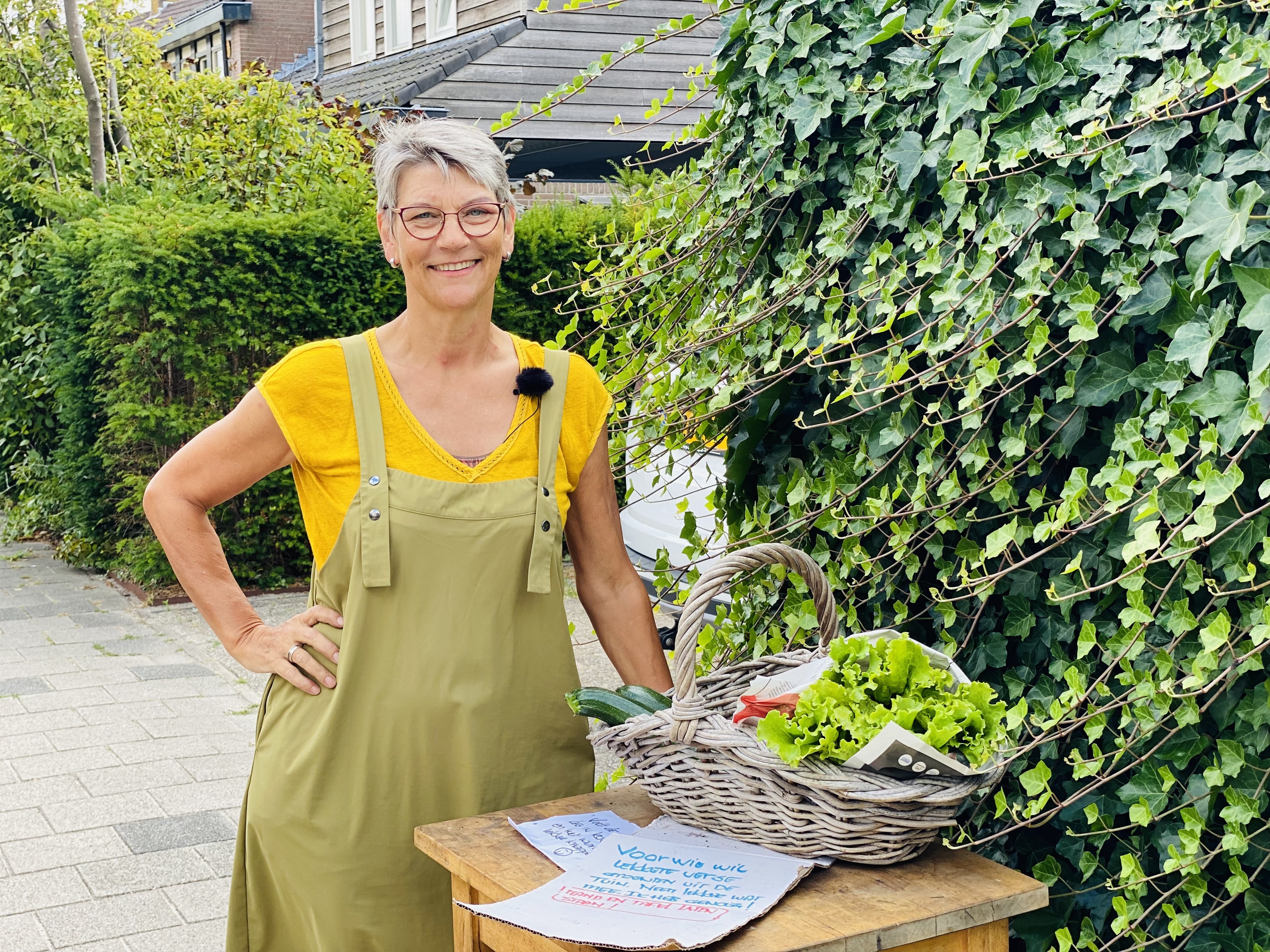 Terug in Bennebroek komt de eerste buurvrouw een kijkje nemen bij het verse groentemandje van Bregje. “Het mandje leeft best wel”, zegt Elly. “Ik ga ’s morgens vaak tennissen en kom hier op de heenweg langs. Op de terugweg is de mand vaak al leeg, dat is voor mij jammer.”