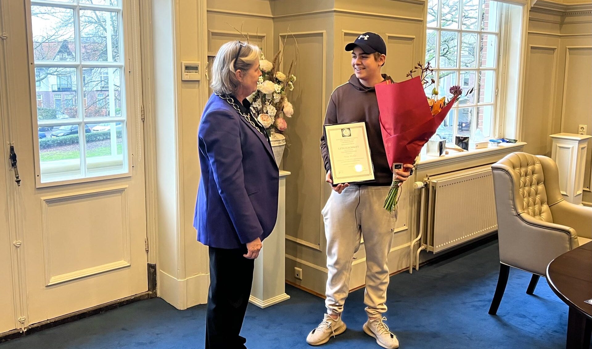 “Ik was onderweg naar vrienden toen ik een klap achter me hoorde”, zegt Nanne als burgemeester van Heemstede Astrid Nienhuis hem de zilveren medaille uitreikt. “Toen draaide ik me om en zag ik de auto in het water. Zonder na te denken ben ik er achteraan gegaan en samen met de andere mannen is het gelukt om de vrouw aan de kant te krijgen.”