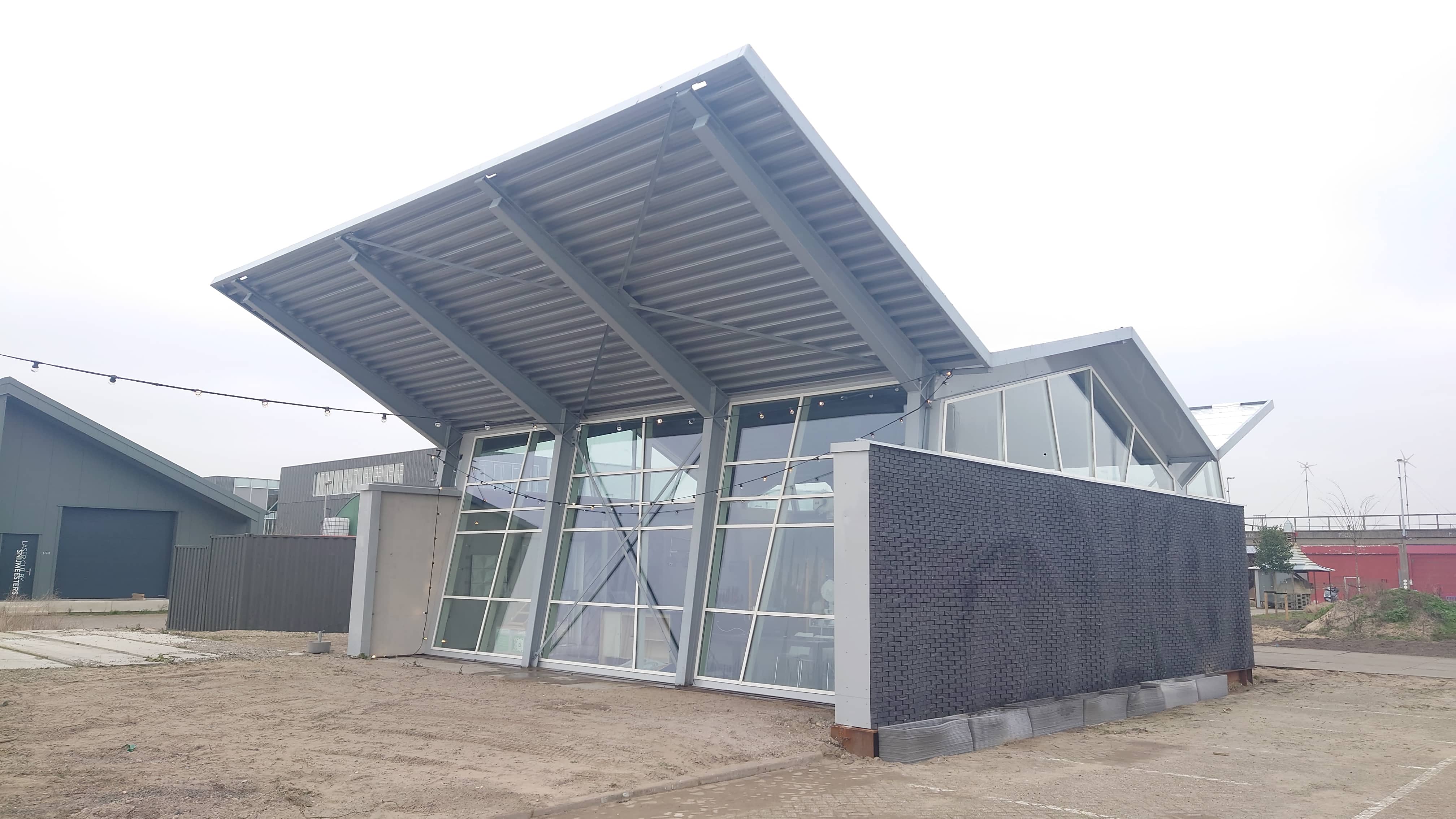 Het gebouw uit Almere kwam zonder muren en dit was gelijk een goede kans om nieuwe innovatieve producten te testen. Zo is er een muur bekleed met hergebruikt PVC, een andere muur weer met hergebruikt kunststof en een derde muur van normale bakstenen, alleen dan gemaakt door een robot.