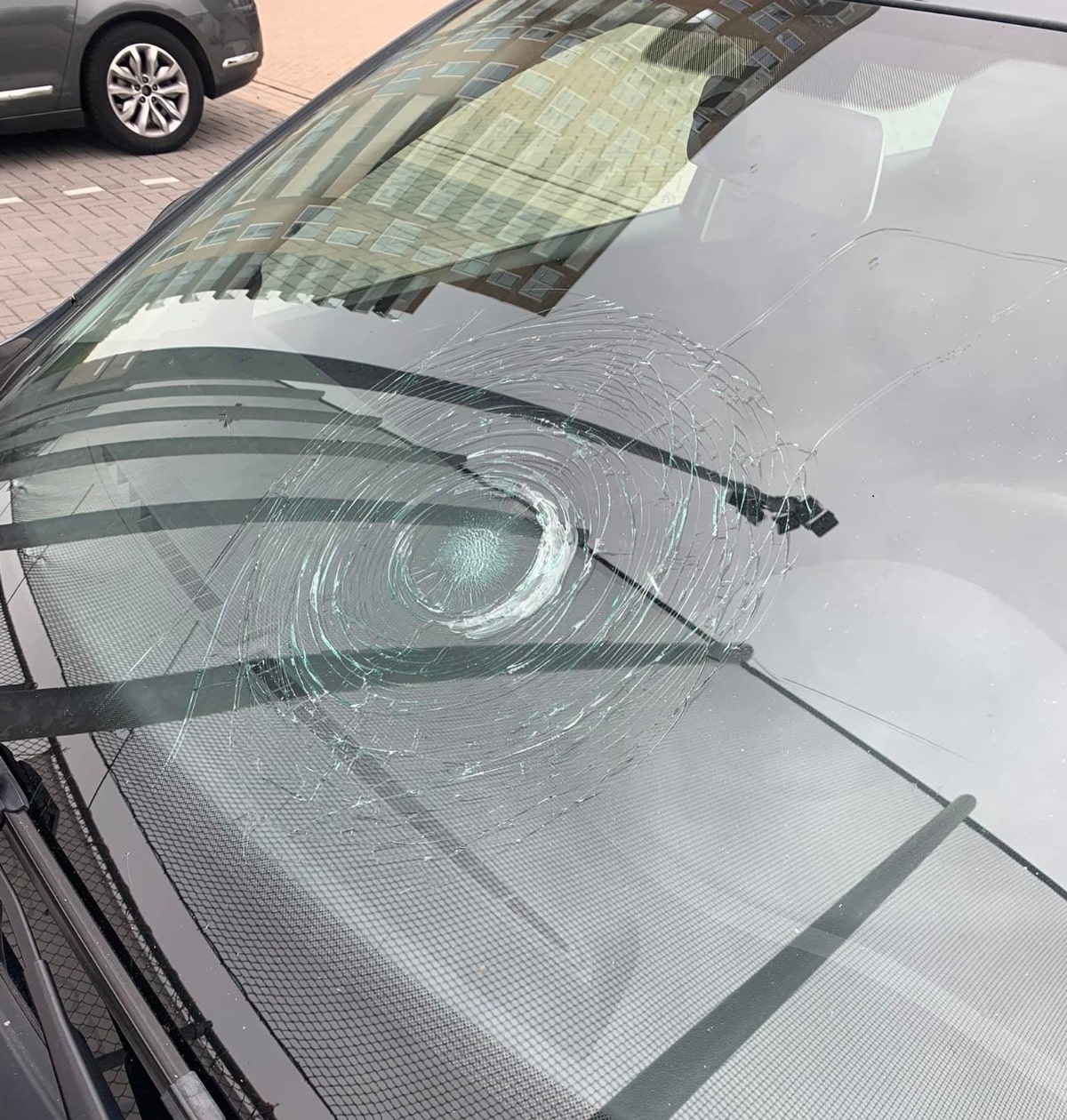 “Wij wonen op twee meter afstand van een honkbalveld wat bedoeld is voor jeugd- en amateurwedstrijden. Nu zijn daar de professionals hun slagoefeningen aan het doen en dan gaat de bal een stuk verder.” De bal gaat zo ver dat deze uit het veld op de auto’s of soms zelfs op de balkons van de nabijgelegen woningen terechtkomt. De voorruit van de auto van Bossen is flink beschadigd “En op de bewoners-Facebookgroep worden signalen gegeven dat iemand op het balkon moest wegduiken voor langsvliegende ballen!”