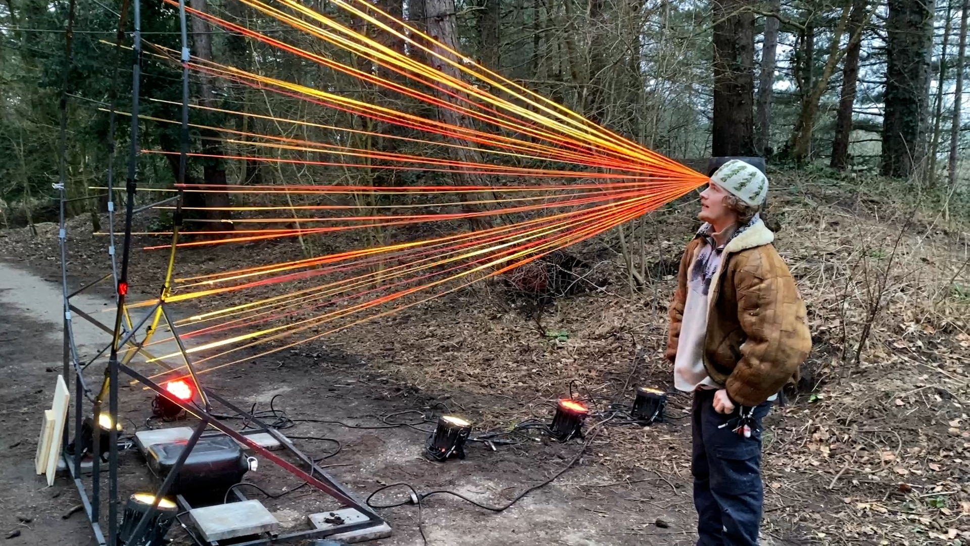 Eén van de artiesten die dit jaar met zijn kunstwerk op het festival te zien is, is Parker Hertzberger uit Eindhoven. Hij heeft een installatie gemaakt waarmee geluid in de lucht zichtbaar wordt. “Ik wil mensen naar het hier en nu brengen met mijn werk”, zegt hij terwijl hij het kunstwerk test. “Het is een hypnotiserende installatie die je even tot stilte brengt in jezelf.”