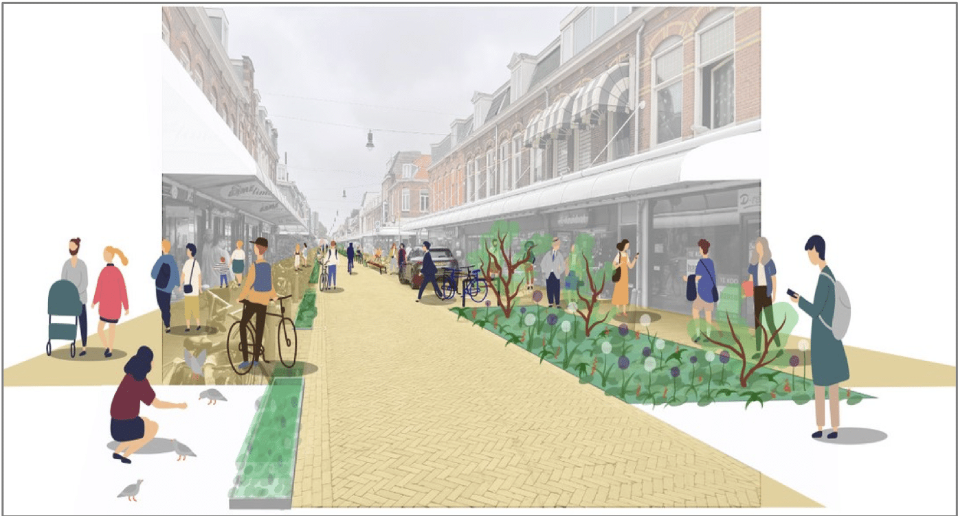 Zo wordt extra ruimte gemaakt voor terrassen en groen. Door de winkelstraat komt een groene strook die zorgt voor een scheiding tussen de rijbaan en het voetpad en een voorzieningenstrook. Die bestaat uit onder meer andere auto- en fietsparkeerplekken, bankjes en terrassen.