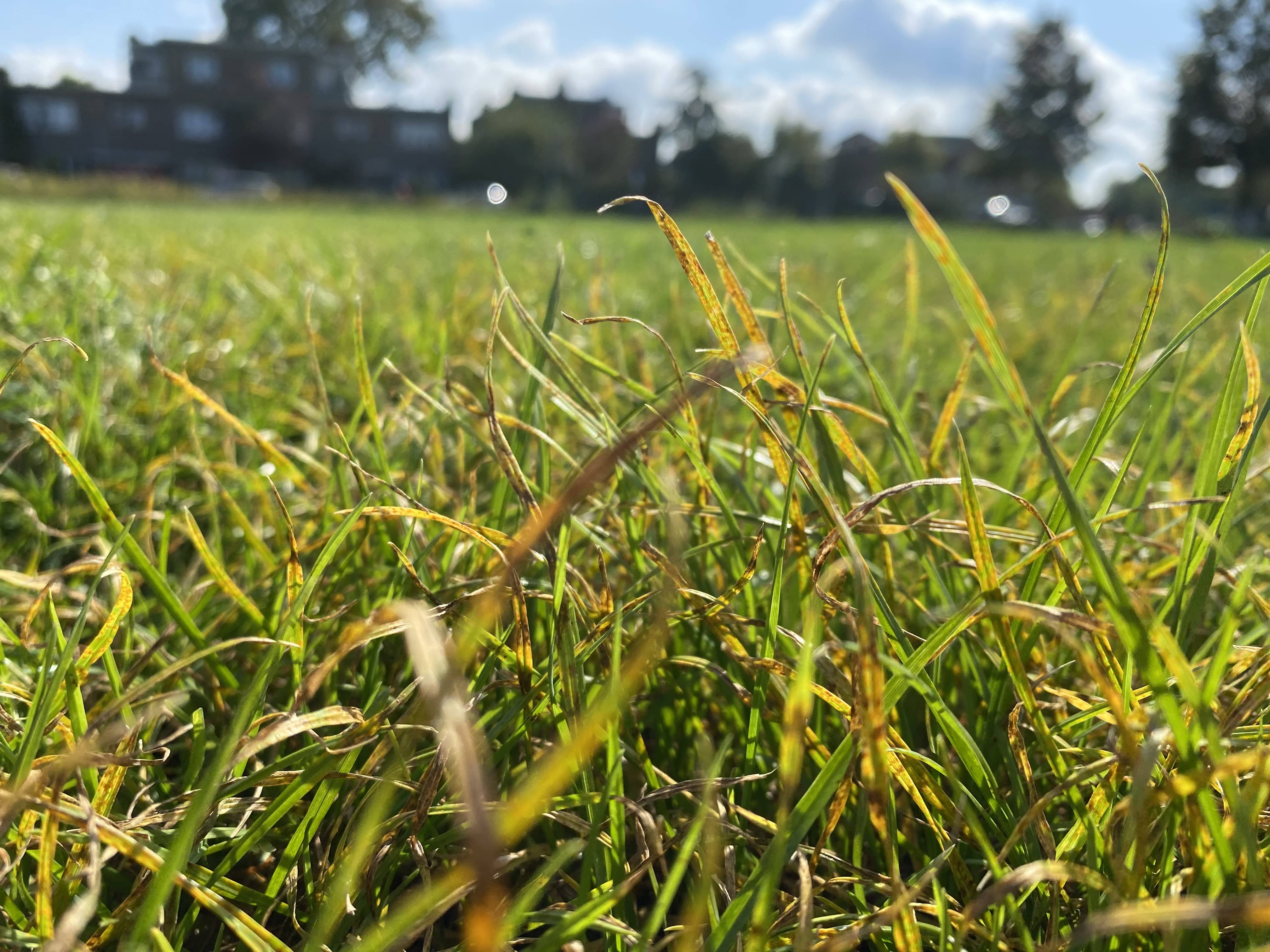 “Dit is waarschijnlijk kroonroest, te herkennen aan oranje sporen op het grasblad. Later zullen dit dode plekjes worden. De schimmel zit alleen in de bladen, de stengel en het bloeiproces van het gras worden niet aangetast. De schimmel komt vaak voor bij vochtig en broeierig weer.”