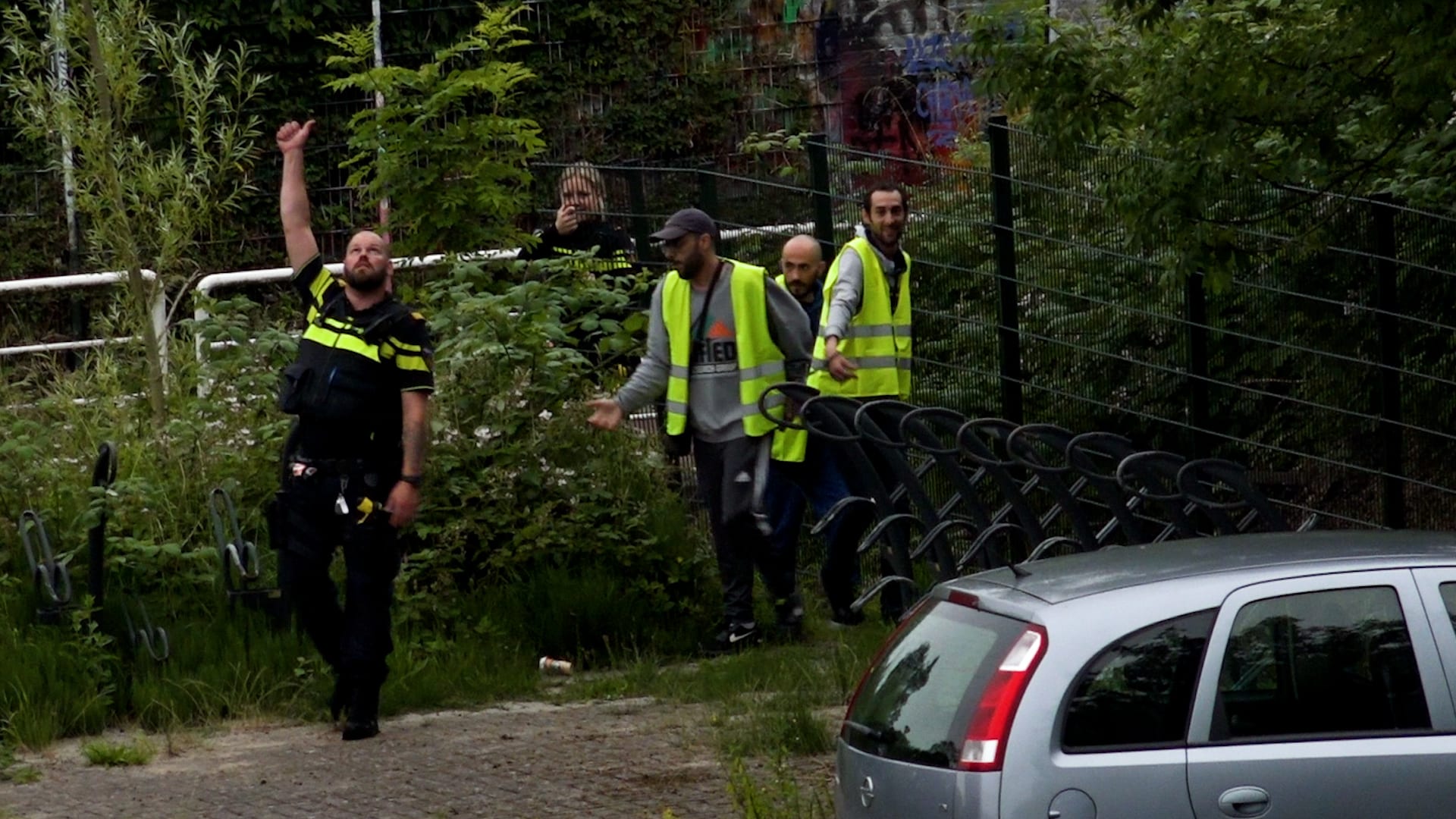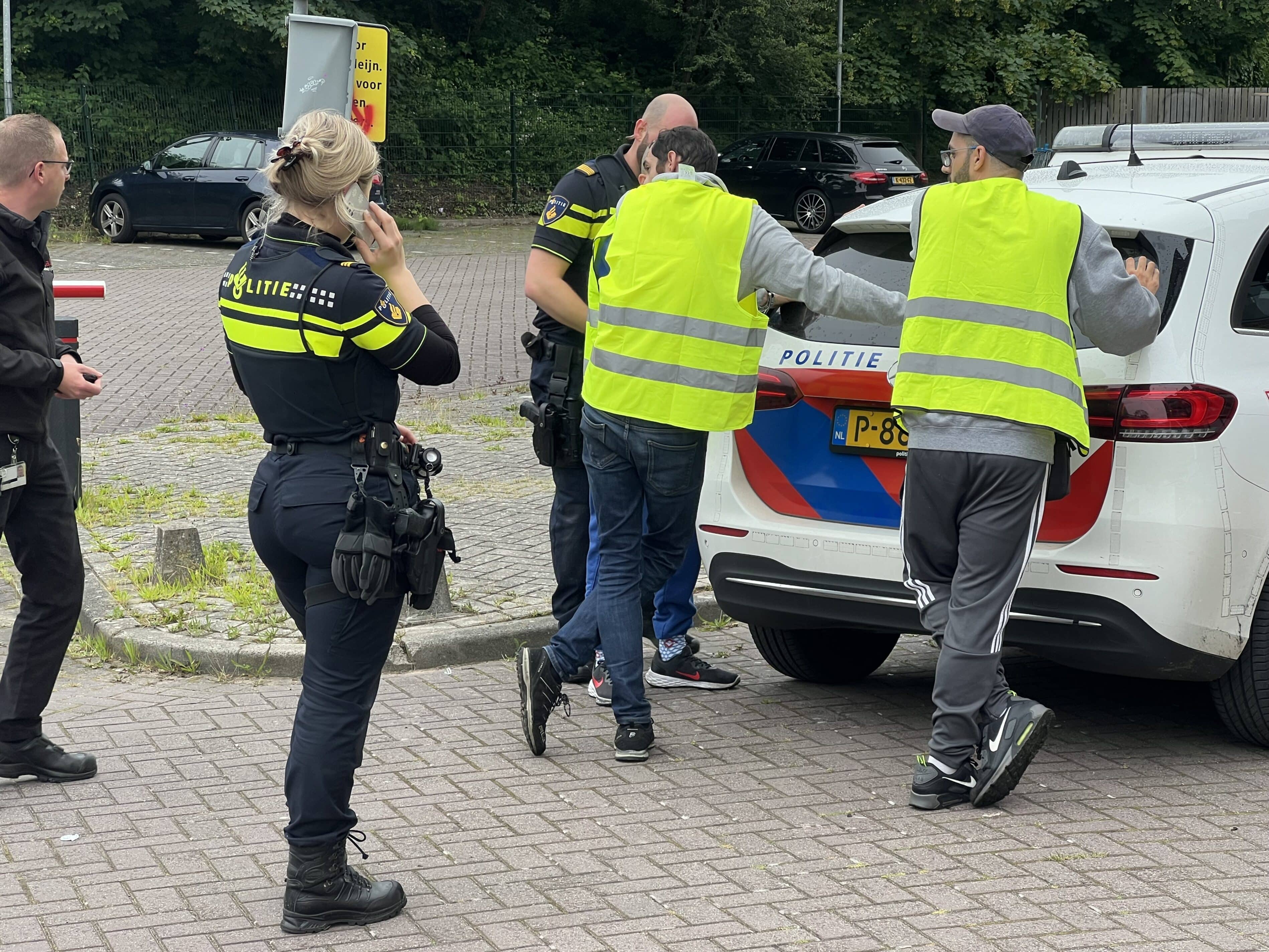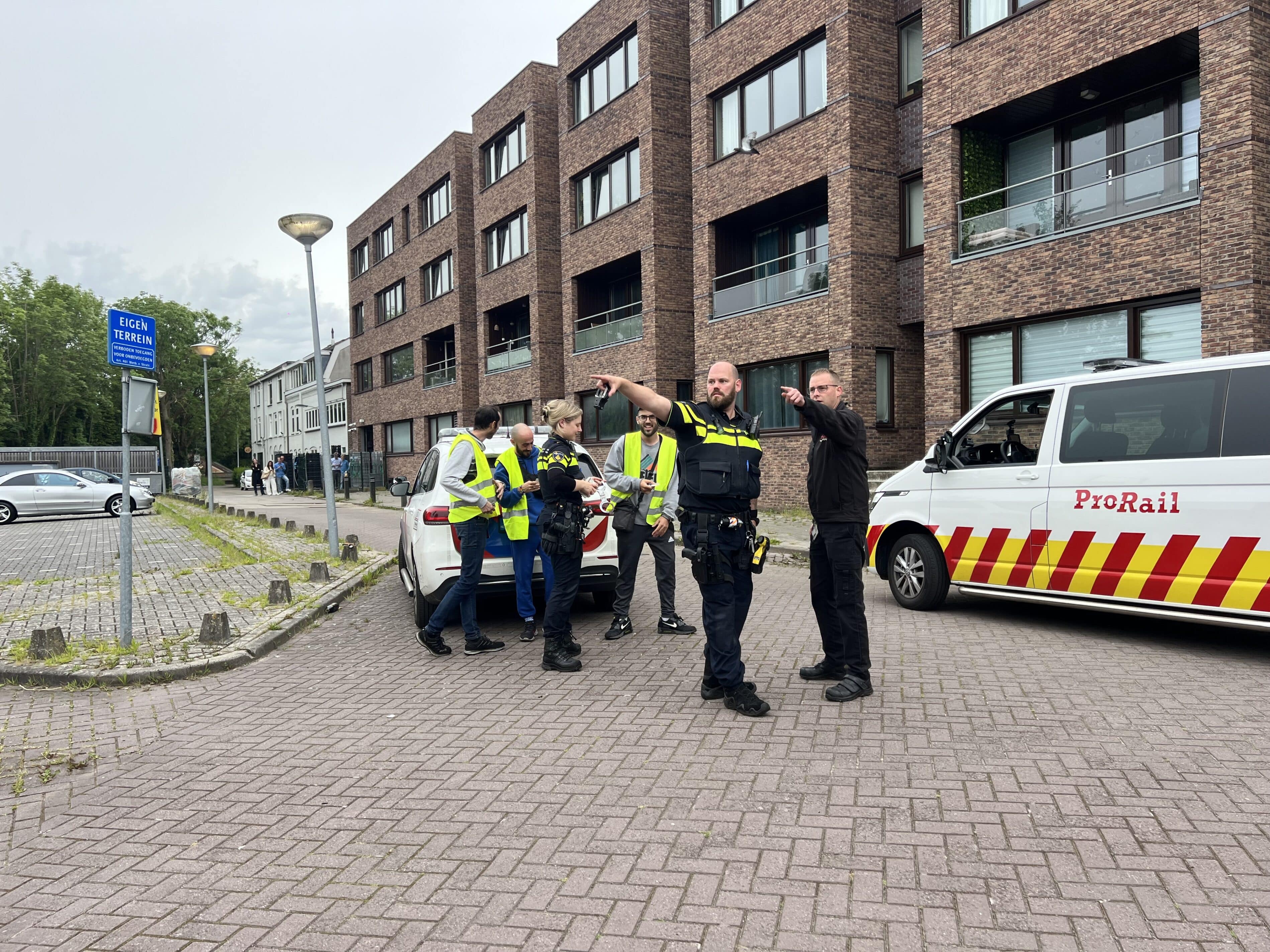 Als de politie aankomt gaan twee agenten het spoor op om naar de mannen te zoeken. Ook cirkelt er een politiehelikopter boven het spoor. Na ruim een half uur komen ze geboeid naar beneden. Volgens de politie zijn ze over het spoor naar de Verspronckweg gelopen en zaten ze onder een trein verstopt.