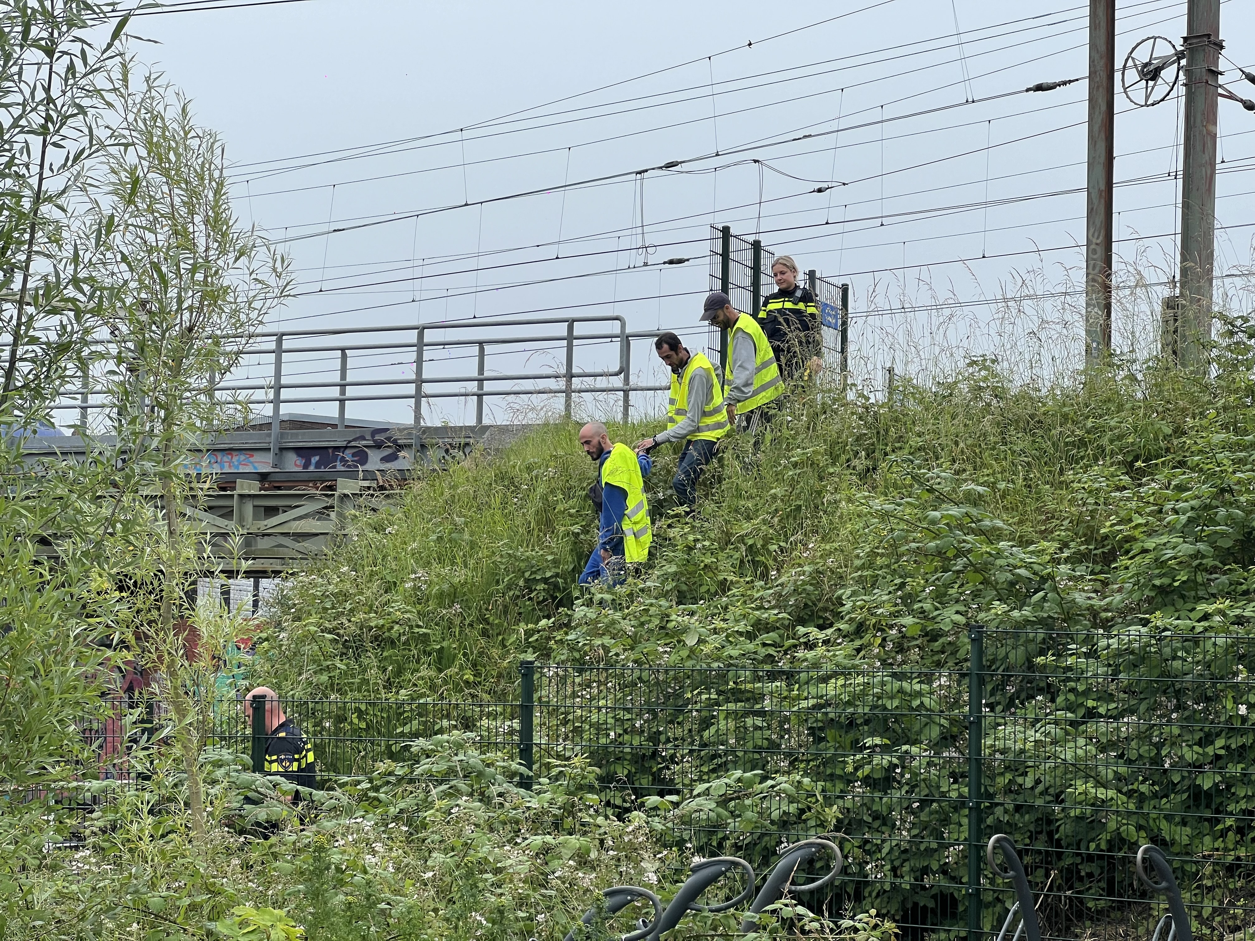 Drie mannen zijn vanmiddag door de politie van het spoor gehaald nadat zij over het hek bij de Garenkokerskade in Haarlem zijn geklommen. Dankzij een oplettende buurtbewoner konden agenten snel ingrijpen. Waarom de mannen op het spoor liepen, is onduidelijk.