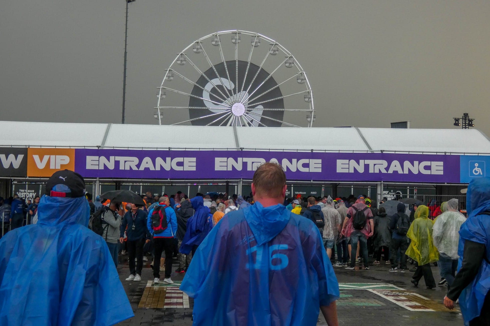 Op het terrein van het circuit is het niet toegestaan om een paraplu mee te nemen. Een slimme verkoopster sprong daar handig op in door langs de route naar het terrein poncho’s te verkopen.