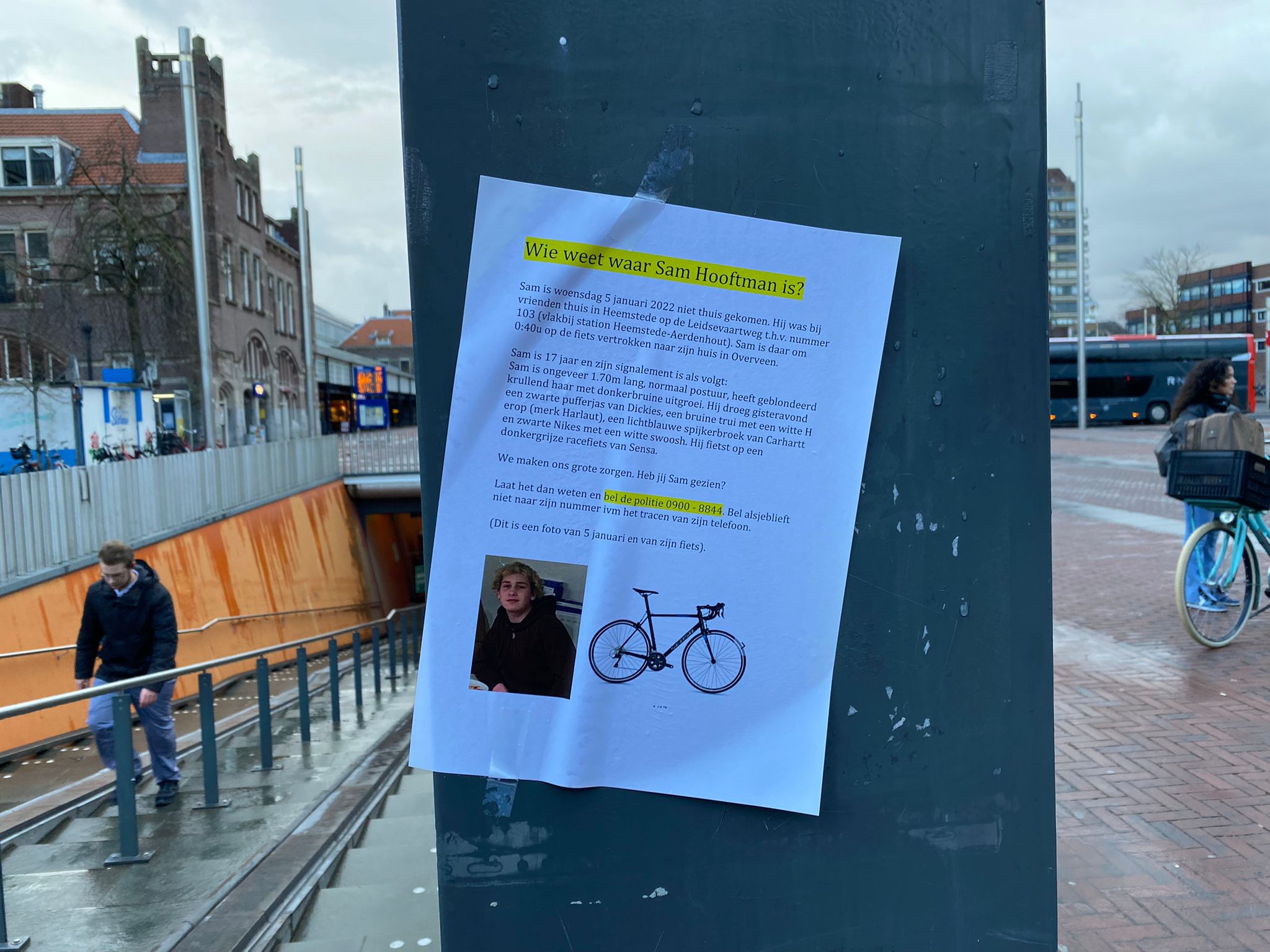 Rond 00.40 uur vannacht vertrok Sam vlak bij het station Heemstede-Aerdenhout naar zijn huis. Hij deed dit op een donkergrijze fiets van het merk Sensa. “Hij is vertrokken vanaf de Leidsevaartweg richting de Volvo-garage “, legt Babs uit. Zijn vrienden hebben hem toen nog uitgezwaaid.