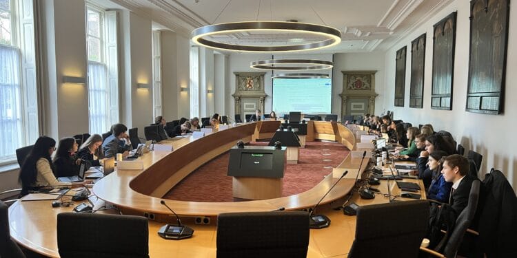 In de raadszaal van het gemeentehuis zitten twee scholieren achter een bordje met daarop het land dat ze vertegenwoordigen. “Ieder land wordt gerepresenteerd door een leerling”, vertelt Julian van Halteren, voorzitter van de vergadering. “Ze praten dus allemaal vanuit hun eigen policy [beleid, red.] en hoe dat land naar de kwestie aankijkt.”
