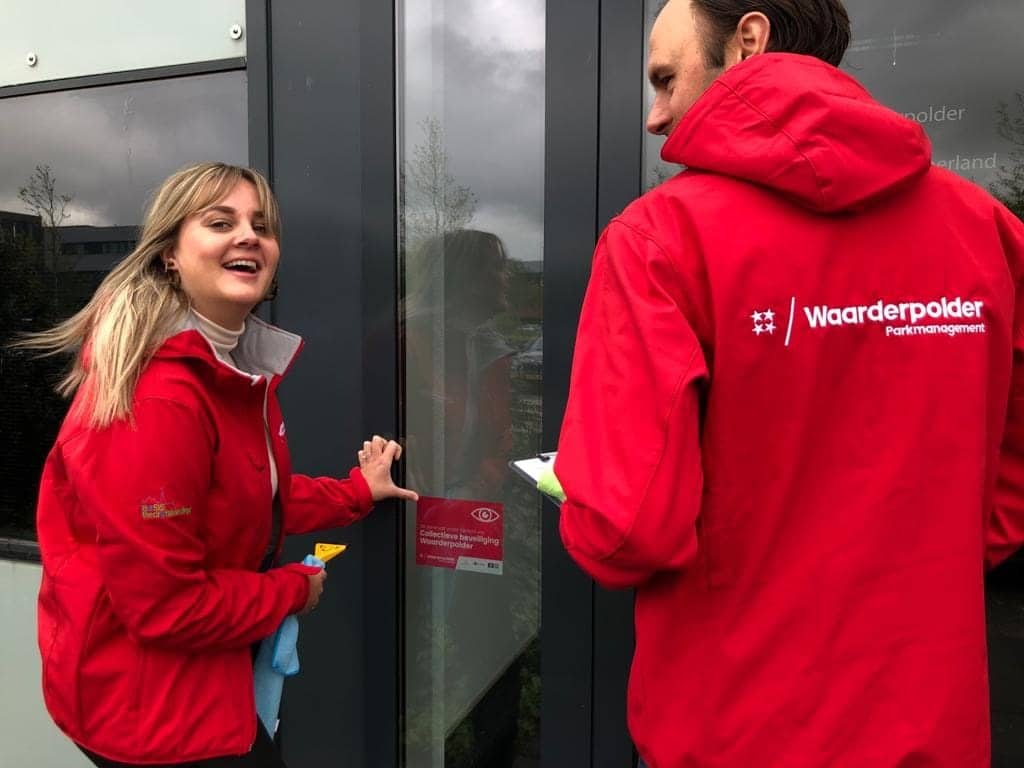 “De studenten zijn te herkennen aan de rode Parkmanagement Waarderpolder jassen. Zij hebben een visitekaartje bij zich, daarop zijn contactgegevens te vinden voor wanneer er vragen zijn over de beveiliging, of over de stickeractie.”