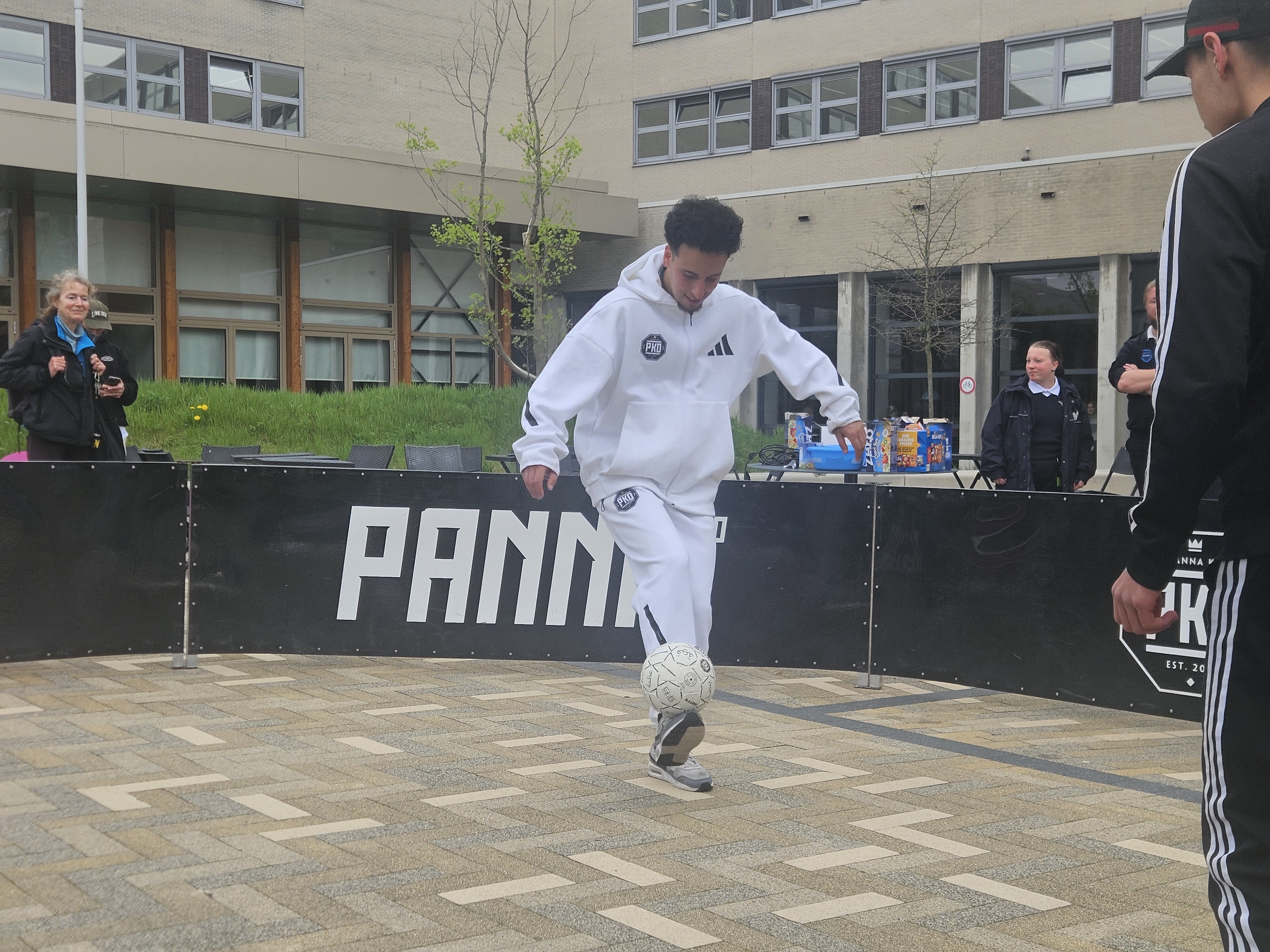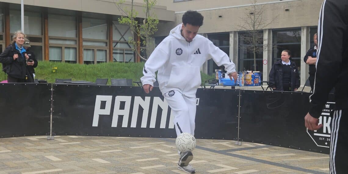 Straatvoetbalicoon Nasser El Jackson speelde gisteren meerdere potjes panna tegen studenten van het Nova College in Haarlem. Panna is een populaire vorm van straatvoetbal waarbij je probeert de bal door de benen van je tegenstander te spelen. Dat zorgde voor veel spektakel en enthousiasme op het schoolplein.