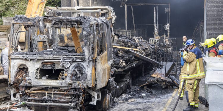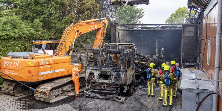 Een bergingsbedrijf heeft vandaag tegen het einde van de middag de uitgebrande vrachtwagen met oplegger uit de laad en los ruimte getrokken van de supermarkt. Een sloopbedrijf heeft even daarvoor een deel van het magazijn gesloopt vanwege instortingsgevaar, voordat de vrachtwagen uit het pand kon worden getrokken. Langzaam is de wagen na het slopen naar buiten gehaald.