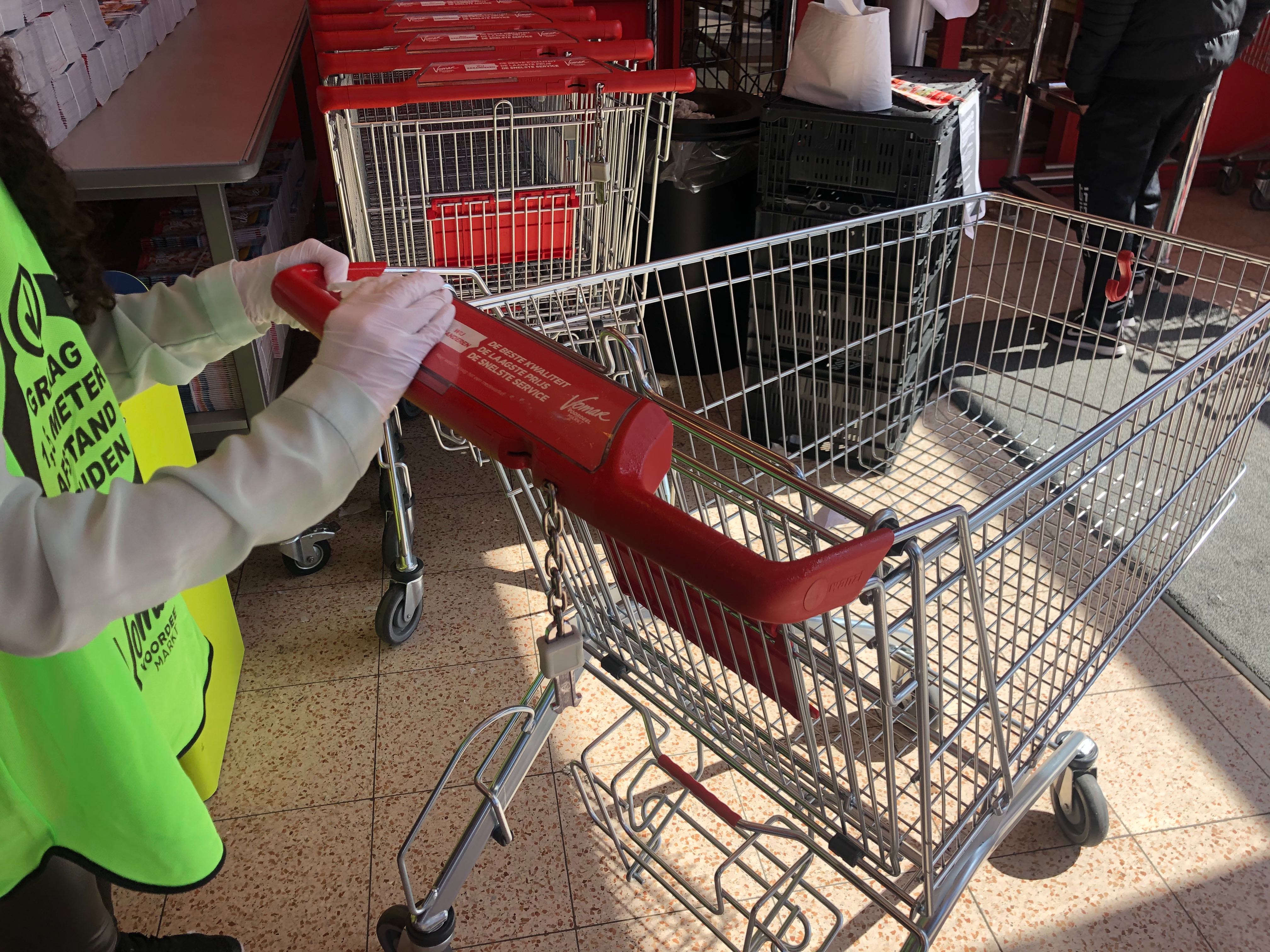 Bij de meeste supermarkten is personeel aanwezig om de winkelwagentjes na ieder bezoek schoon te maken, bij kleinere fililalen staat een fles met ontsmettingsmiddel en doekjes klaar om dit zelf te kunnen doen. Bij grotere winkels is ook de route naar binnen en naar buiten aangepast om te kunnen voldoen aan de 1 bezoeker per 10 m2 regel. Daar zijn vaak ook extra beveiliging en zelfs parkeerwachten voor ingehuurd om alle bezoekersstromen goed te regelen.
