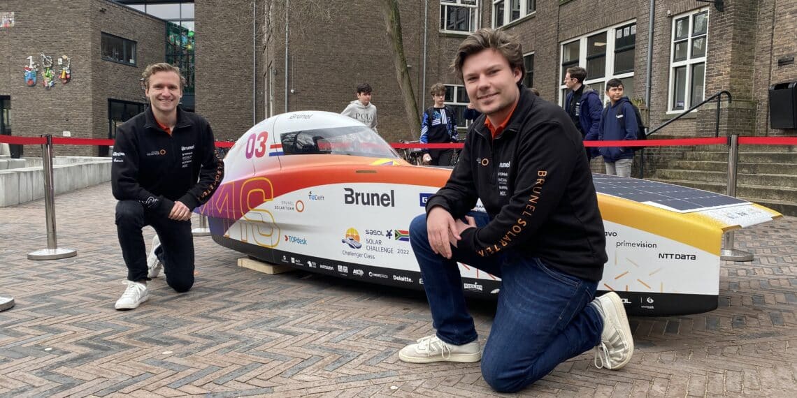 “Het is niet echt een dag voor een zonneauto”, lacht Tijn van Weel (23), terwijl de regen uit de hemel neerdaalt. Hij is teruggekomen naar zijn oude middelbare school Het Eerste Christelijk Lyceum in Haarlem om te laten zien aan welk project hij nu werkt. Daarom heeft hij ook de Nuna 11 meegenomen. Het is de zonneauto die vorig jaar in Zuid-Afrika een grote racewedstrijd won, de Sasol Solar Challenge.