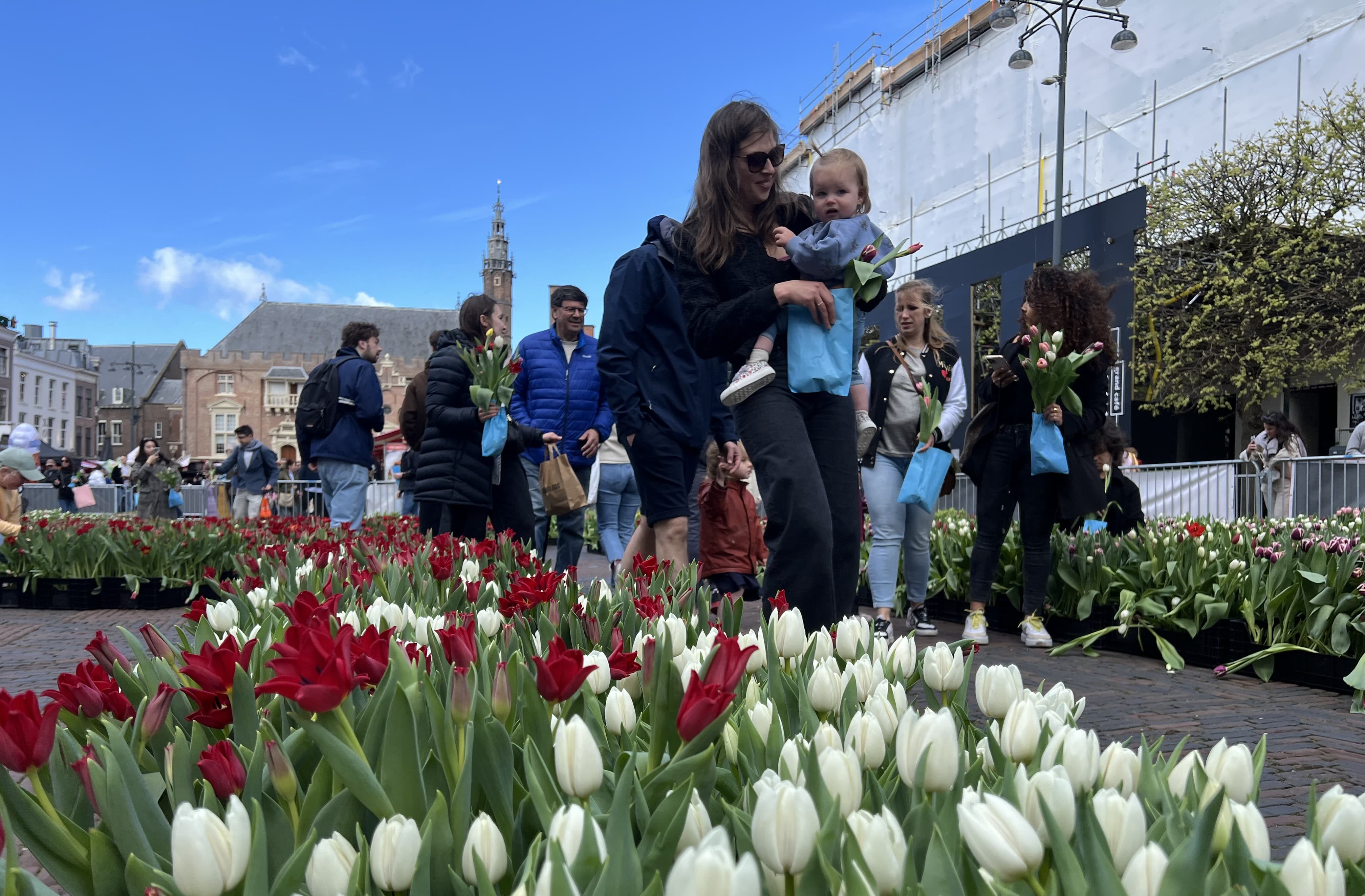 Een deel van de Grote Markt in Haarlem was zondag omgetoverd tot een bloemenzee. De pluktuin met 40.000 tulpen moet het winkelend publiek stimuleren om in de binnenstad te winkelen in plaats van online. Sinds corona is er meer leegstand in Haarlem en hebben ondernemers het zwaar volgens organisator Suzanne van Luijk.
