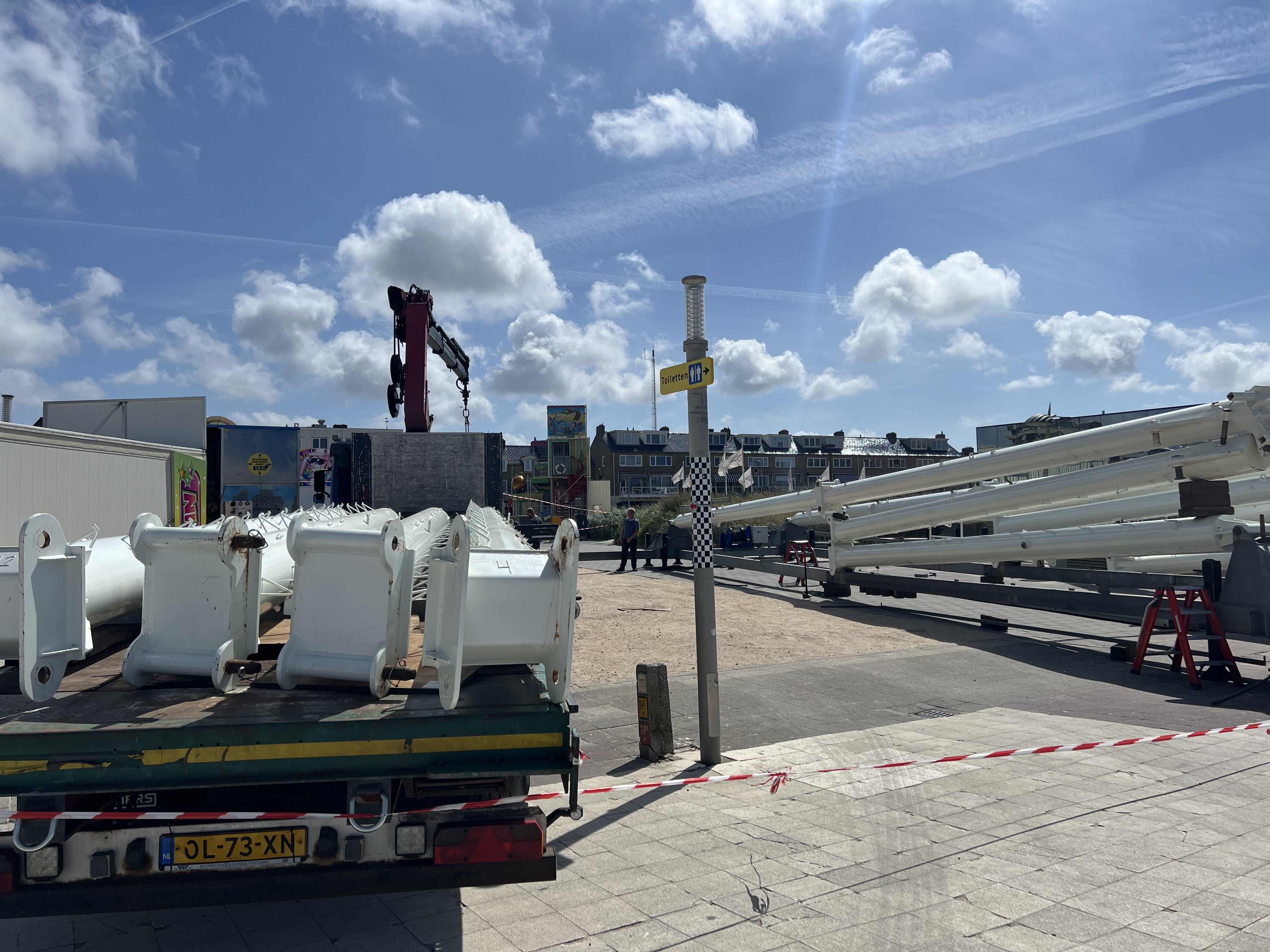 Inmiddels is het vervangende reuzenrad op locatie en is de opbouw begonnen. “Als het goed is staat het reuzenrad binnen anderhalve dag. Vrijdag in de loop van de dag is het klaar, dan wordt het nog gewassen en schoongemaakt. Ik koers erop dat we om vier uur, als de rest van het festival draait, ook gaan draaien.”