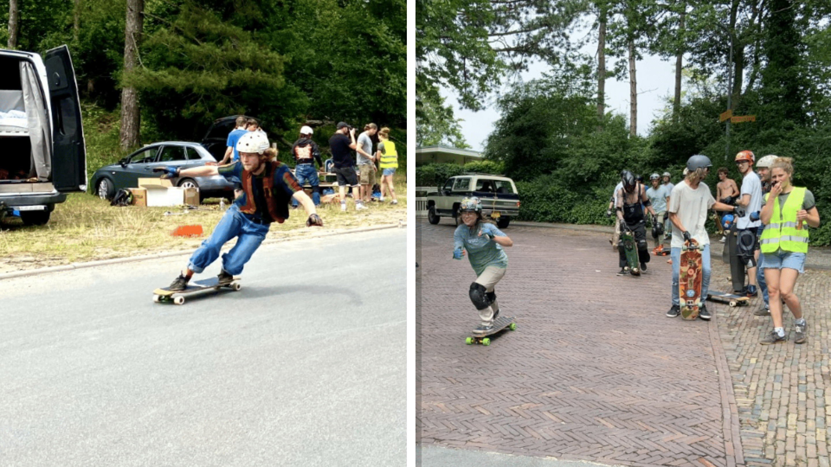 Omdat de weg niet kon worden afgezet hielden de skaters goed in de gaten of er fietsers en auto’s aankwamen. “Veiligheid is belangrijk dus houden we met walkietalkies en gebaren contact om aan te geven of het veilig is om te starten.”